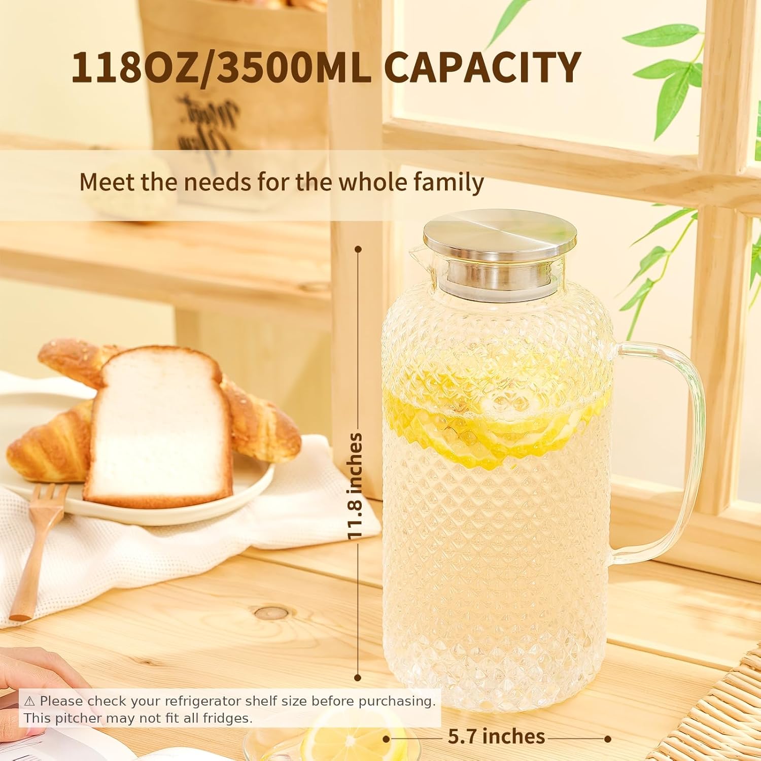 - [Spacious 3.5L Capacity]: With a generous 3.5L capacity, our pitcher is perfect for restaurants, parties or daily use. Its ample size reduces the need for frequent refills, saving you time and effort. It can hold water, milk, coffee, fresh juice, wine or any other beverage. [Note]: Please check your refrigerator shelf size before purchasing. This pitcher may not fit all fridges.
