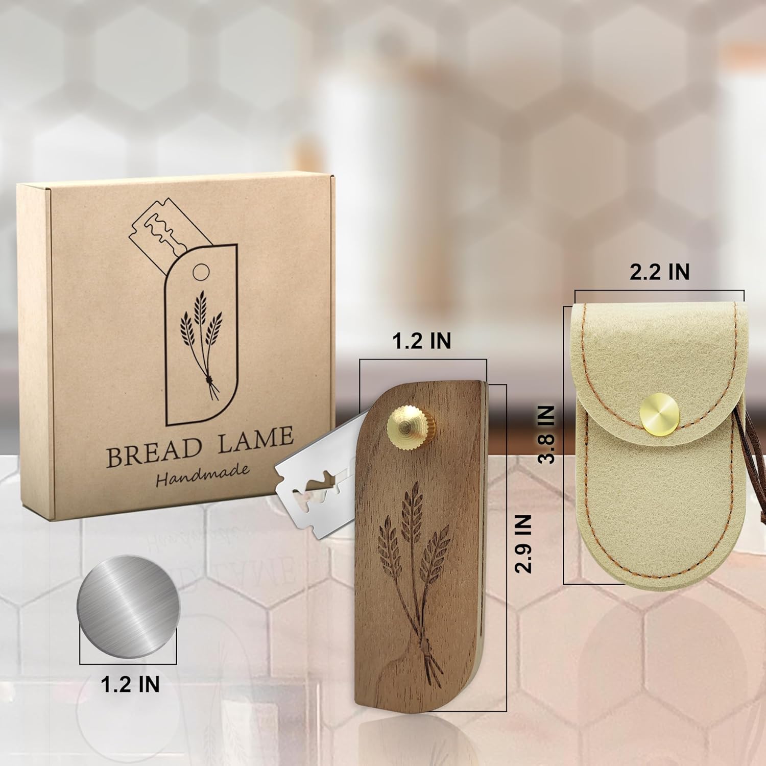 - [Packaging List] The bread scoring tool comes with 10 razor blades, 1 portable storage bag, 1 black walnut handle, and 1 steel plate with adhesive backing
