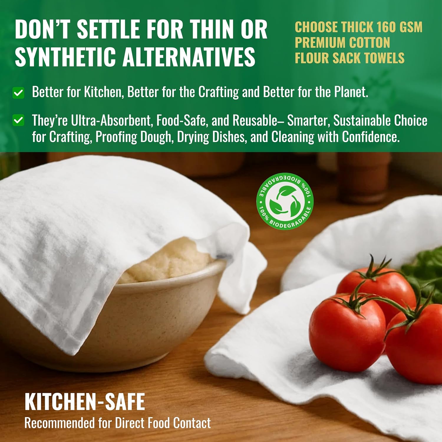 - ✅ Premium 160 GSM Thick Flour Sack Towels – Kitchen-Grade Absorbency Say goodbye to flimsy towels! LITO's ultra-dense 160 GSM 100% ring-spun cotton fabric with a thread count of 130, flour sack towels deliver superior thickness and plush softness—perfect for kitchen drying, wiping, and heavy-duty use.