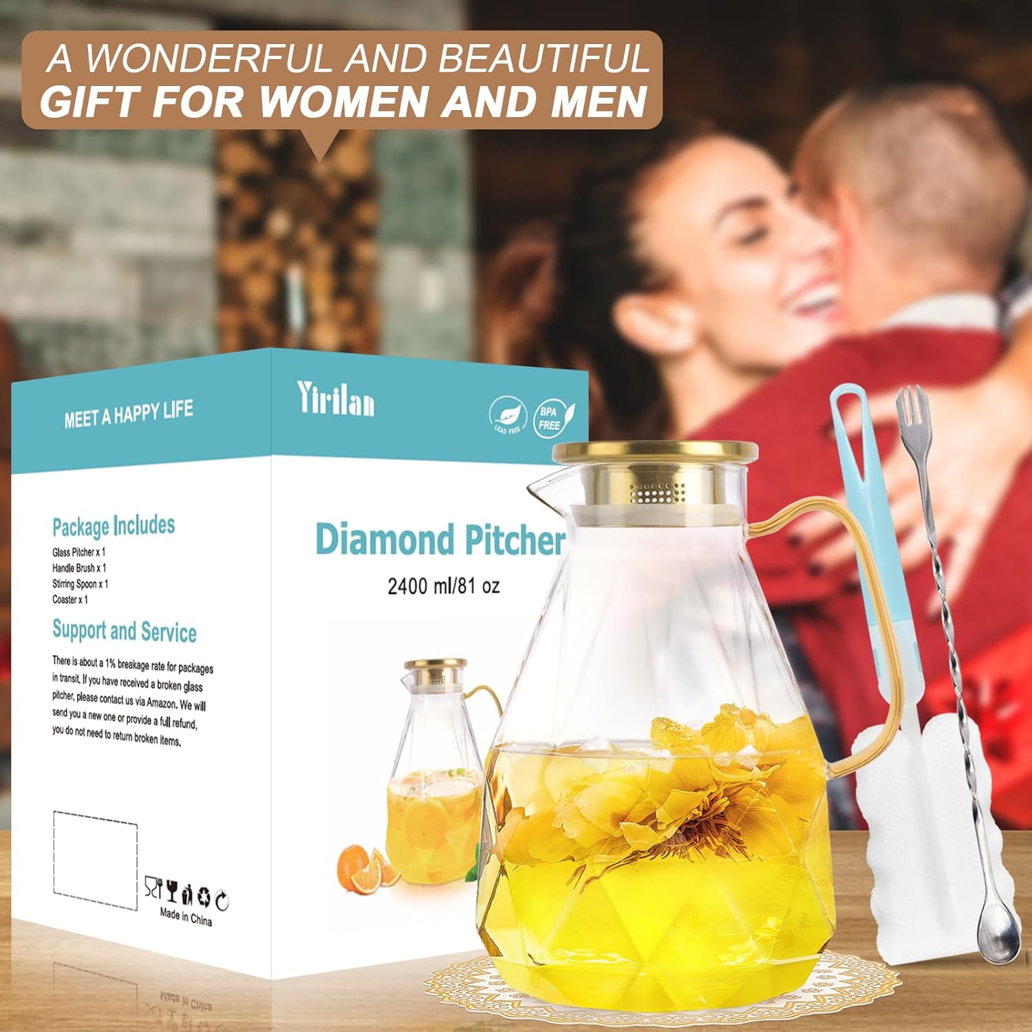 Yirilan Glass Pitcher, 2.4Liter Water Pitcher With Lid, Iced Tea Pitcher for Fridge, Glass Water Carafe With Lid, Glass Water Jug, Large Drink Pitcher For Juice, Milk, Cold Or Hot Beverages, 2400ML