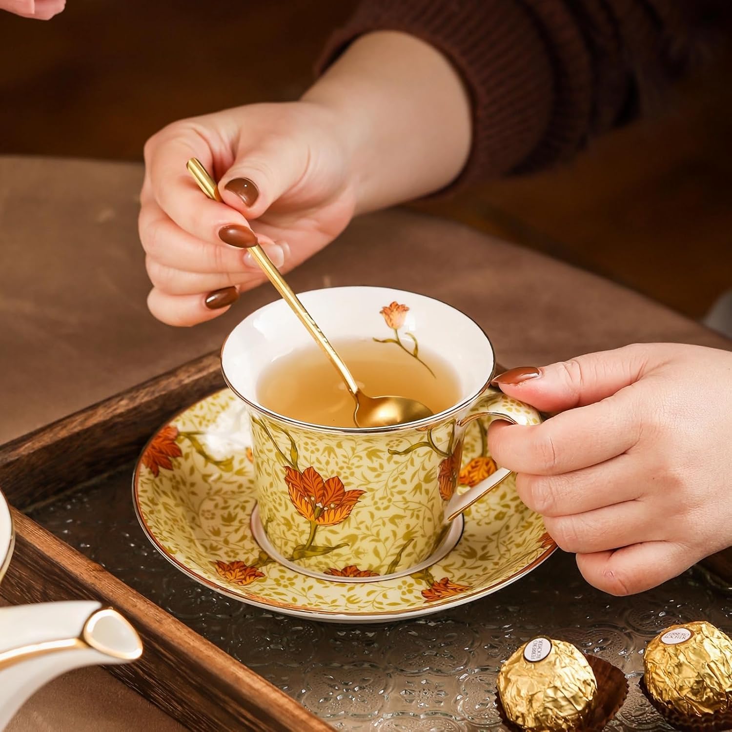 ACMLIFE Tea Set for Adults- Fine China Tea Set for 6, 21-Piece Vintage British Coffee Set English Porcelain Tea Pot Sets for Adult Tea Party for Women Gift (Tulip Yellow, Extra Large 21)