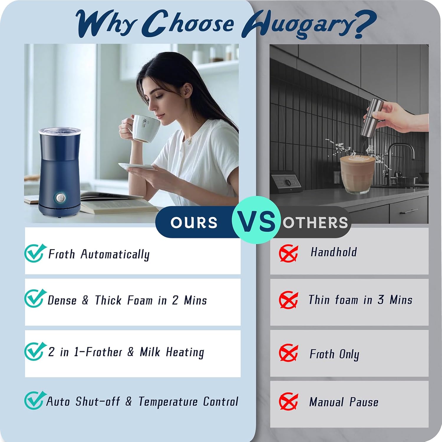 - ☕ Simple 2 Function Milk Frother --- Huogary electric milk frother with 2 modes: hot milk foam and heated milk. Making it the perfect addition to your coffee maker or espresso machine set. You can easily choose between foam and hot milk without worrying about it.