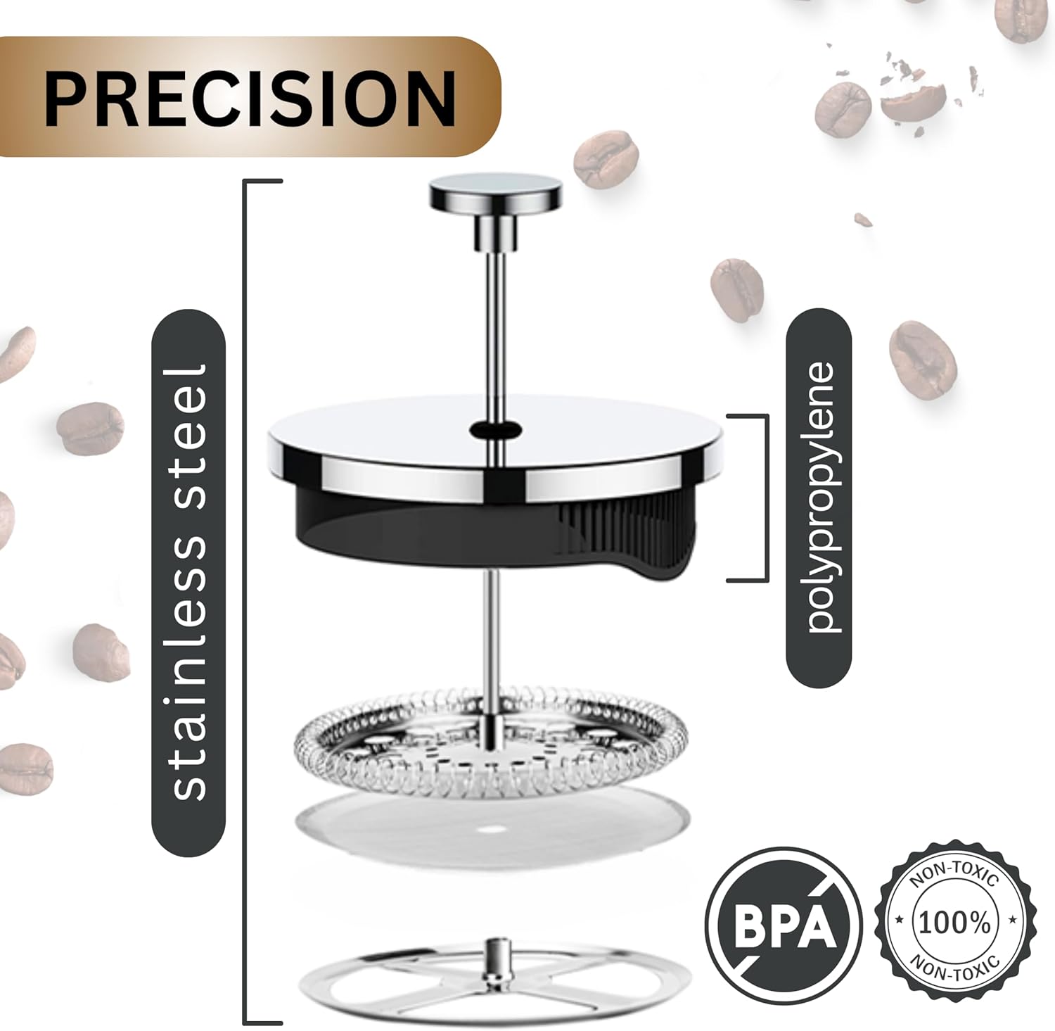 - PRECISION FILTRATION: Robust 4-level filtration system with a built-in lid strainer, durable 304 stainless steel filter, and 80-mesh screen, effectively trapping small particles. Our 20oz (500ml) coffee presses brew 2 cups of flavorful, residue-free coffee every time.