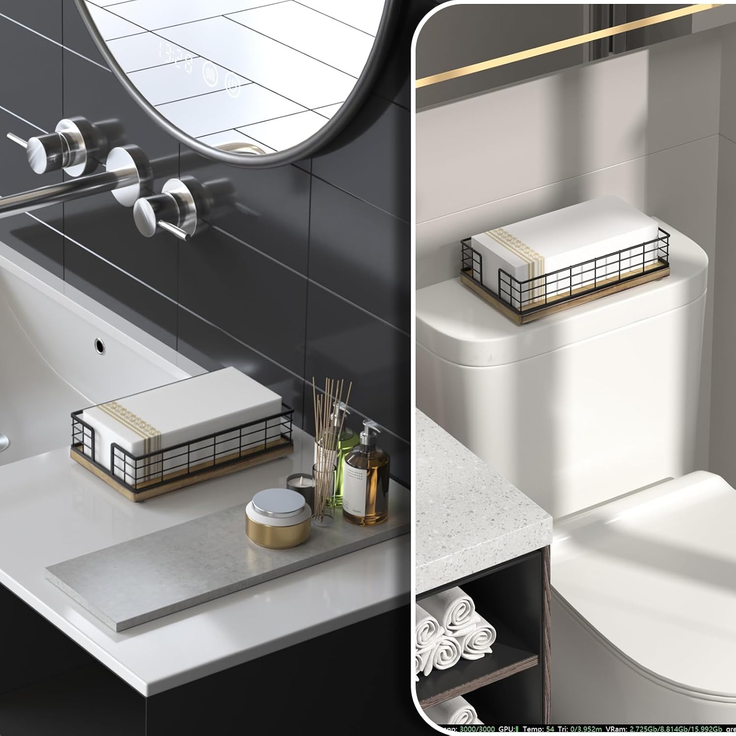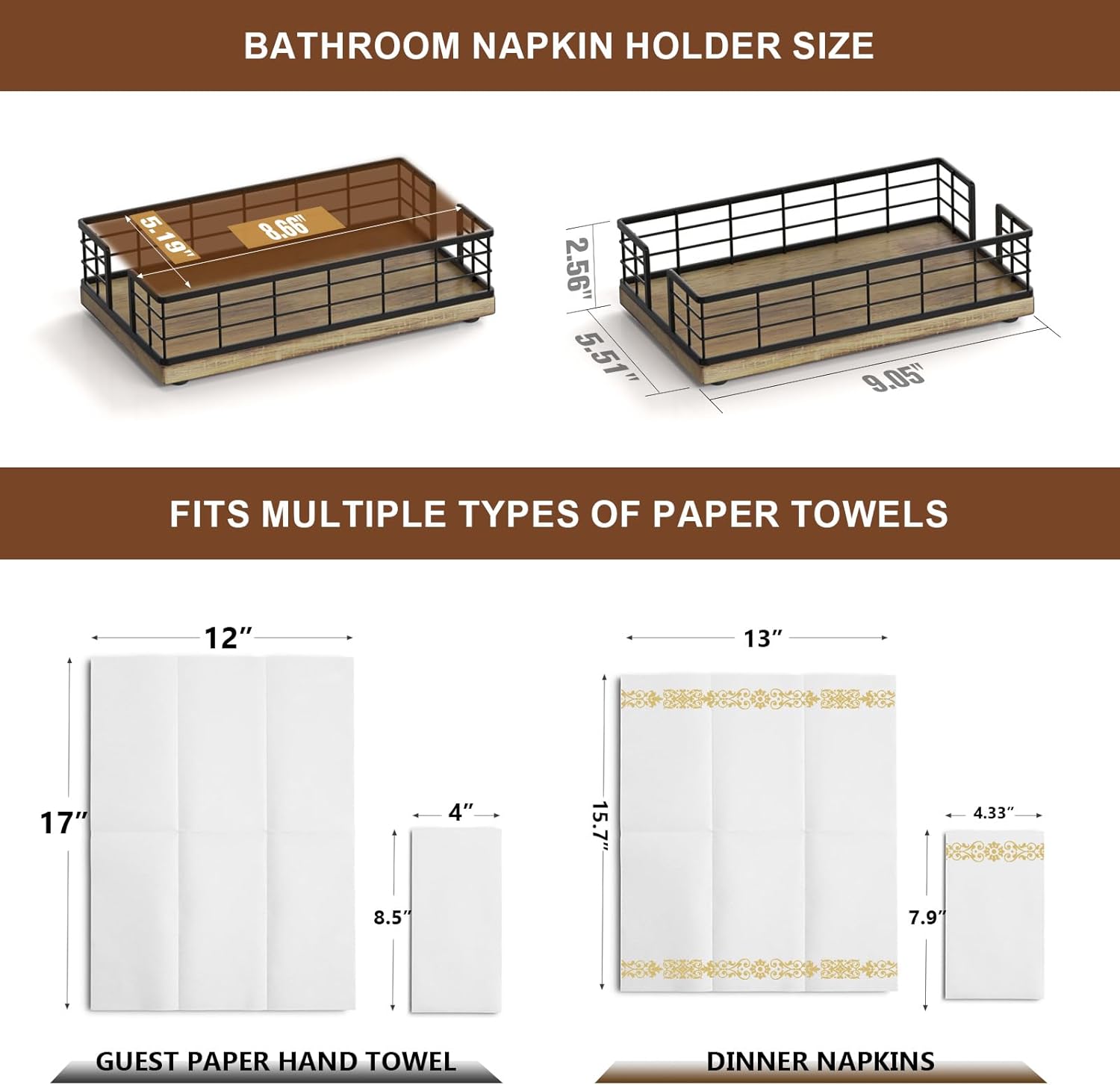 Wican Guest Towel Holder Tray for Bathroom, Oak and Iron Napkins Holder for Powder Room Dinning Table Wooden Basket for Disposable Paper Hand Towels Black and Farmhouse Brown