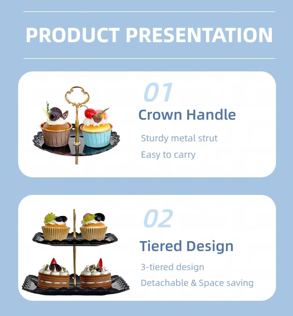 - Exquisite workmanship: Black plastic relief design cake stand with a delicate sturdy gold stents, can show your carefully prepared dessert snacks and cakes, also an attractive ornament on the table