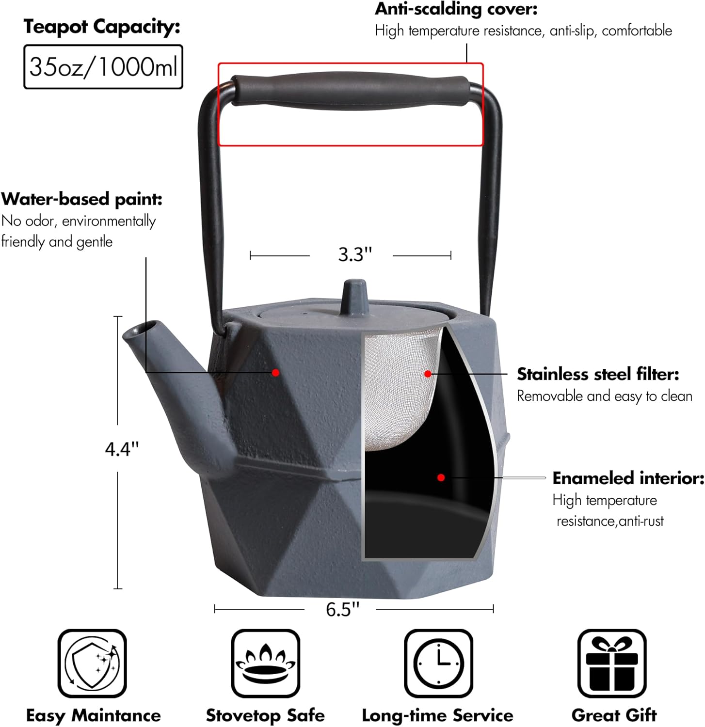 - Premium Materials: The stainless steel tea infuser separates the tea leaves from the water, making them easy to remove and clean. The food grade enamel interior ensures rust resistance and corrosion protection. Our odorless water-based paint provides a luxurious texture and is safe for users.