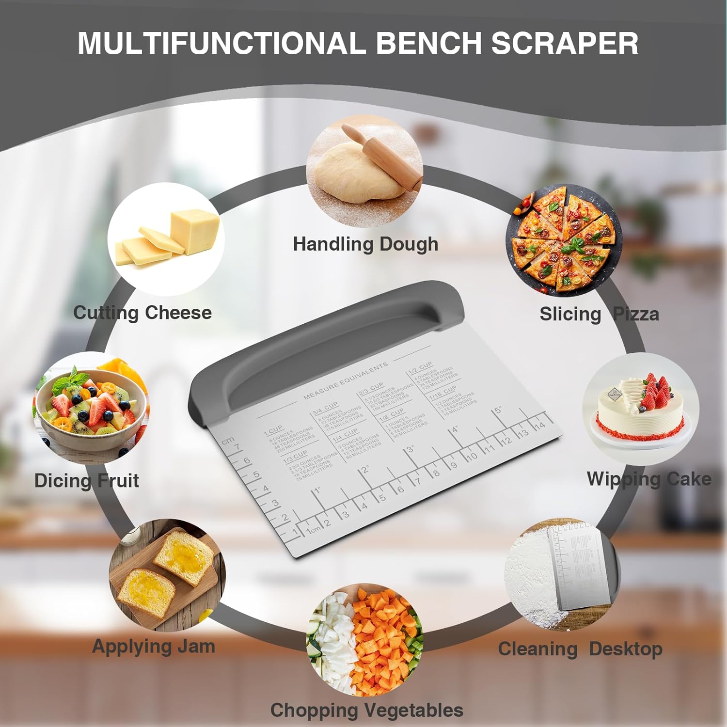 - β [π£π₯πππ§ππππ πππ¦πππ‘] The kitchen bench knife has an easy-grip handle that is ergonomically designed for maximum comfort and control, preventing slipping. Dough scraper for baking is designed with measurement markings and conversion chart which use advanced laser-engraved technology for easily measuring