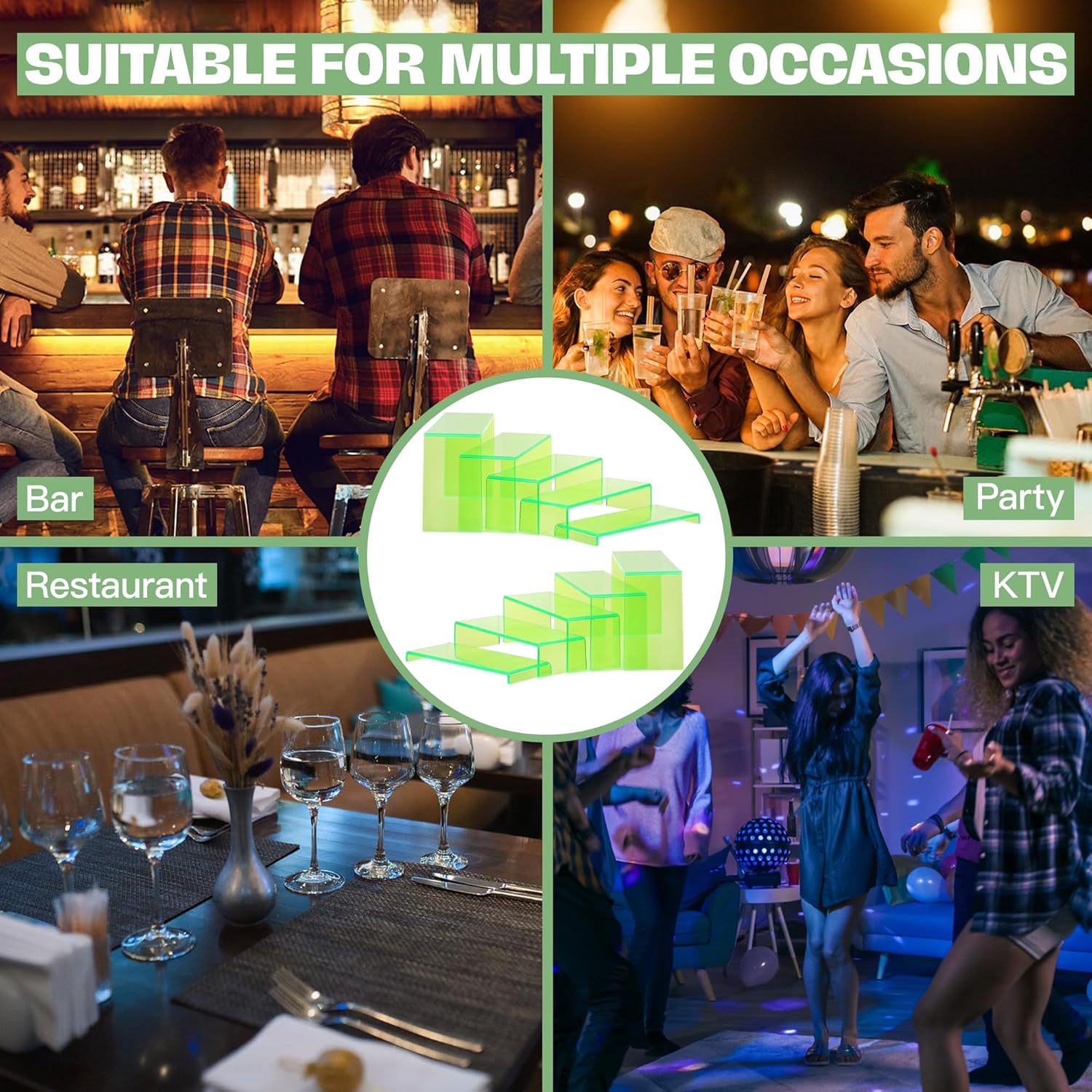 Goabroa Acrylic Display Risers, 2 Sets 10 Pcs Perfume Stand Organizer, Rectangular Acrylic Display Shelves for Figures, Cupcake, perfume, Wine Glass and Handbag, Transparent Green