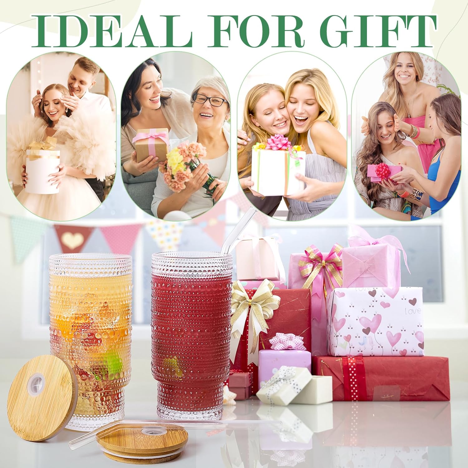 - 【What You Will Get】 2PCS 16OZ Embossed Glass Cups with Bamboo Lids, 2PCS reusable glass straws, 1PC cleaning brushes. ---The cups are dishwasher safe and microwave safe, very practical combination set, take it home without hesitation