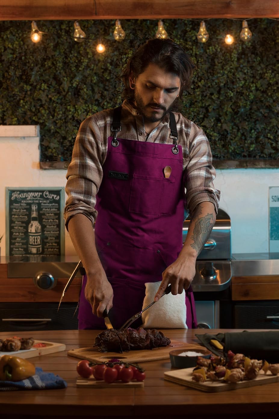 - EXTREMELY VERSITILE – The aprons are designed to be used for grilling, cooking in the kitchen or crafting in the workshop. With three large pockets, cell phone holder, pen slot and bottle opener/utility clip, you can keep all of your essential tools on hand. Straps are also removable for easy cleaning and care!
