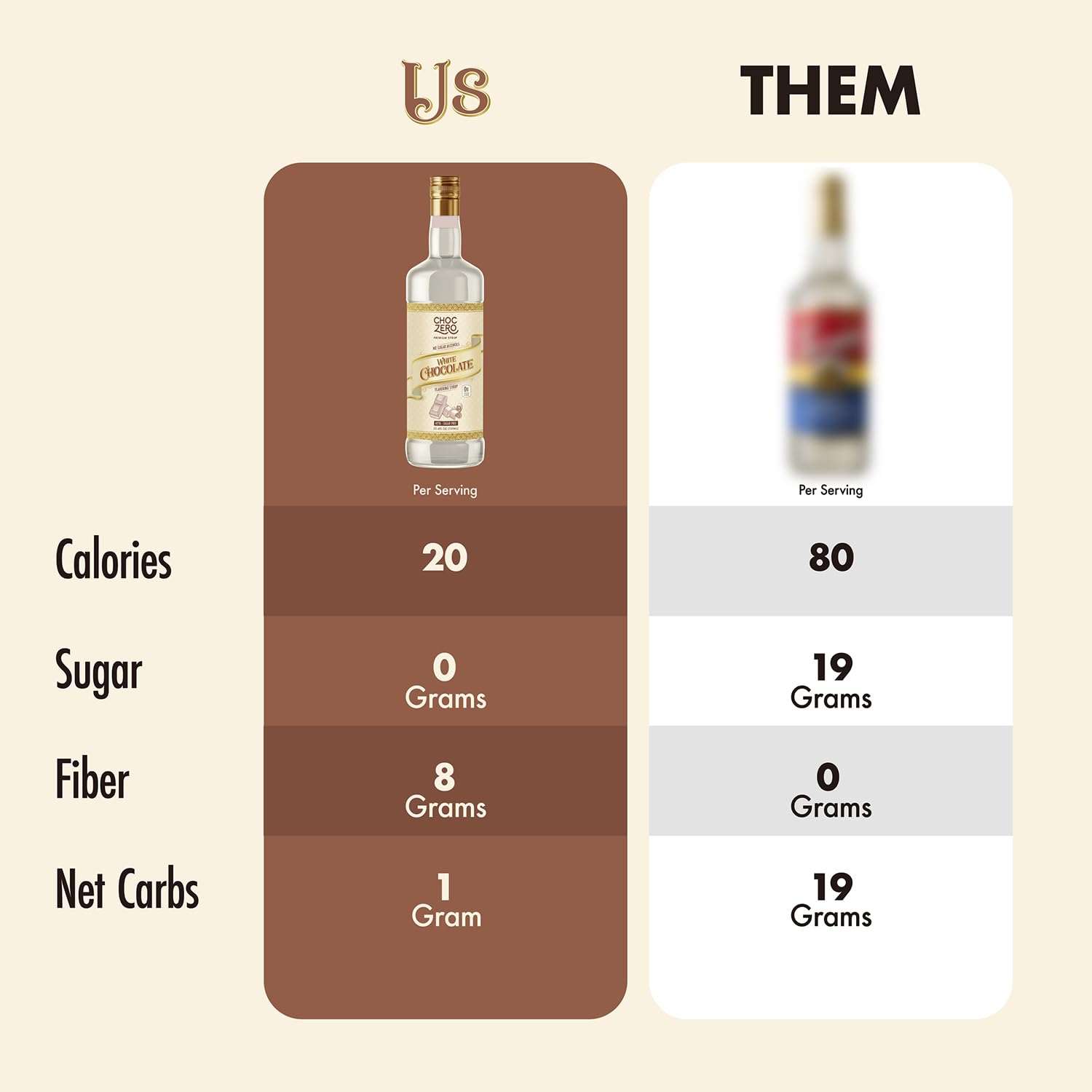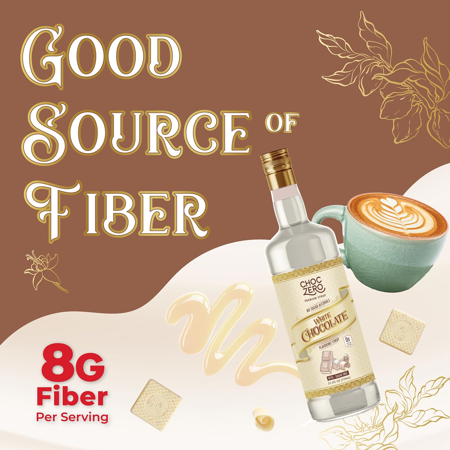 - Our white chocolate syrup has no added sugar, but we do add a secret ingredient: prebiotic fiber! The first functional fiber syrup for coffees, ChocZero's coffee syrup lets you add fiber to promote gut health and feel full with every sip