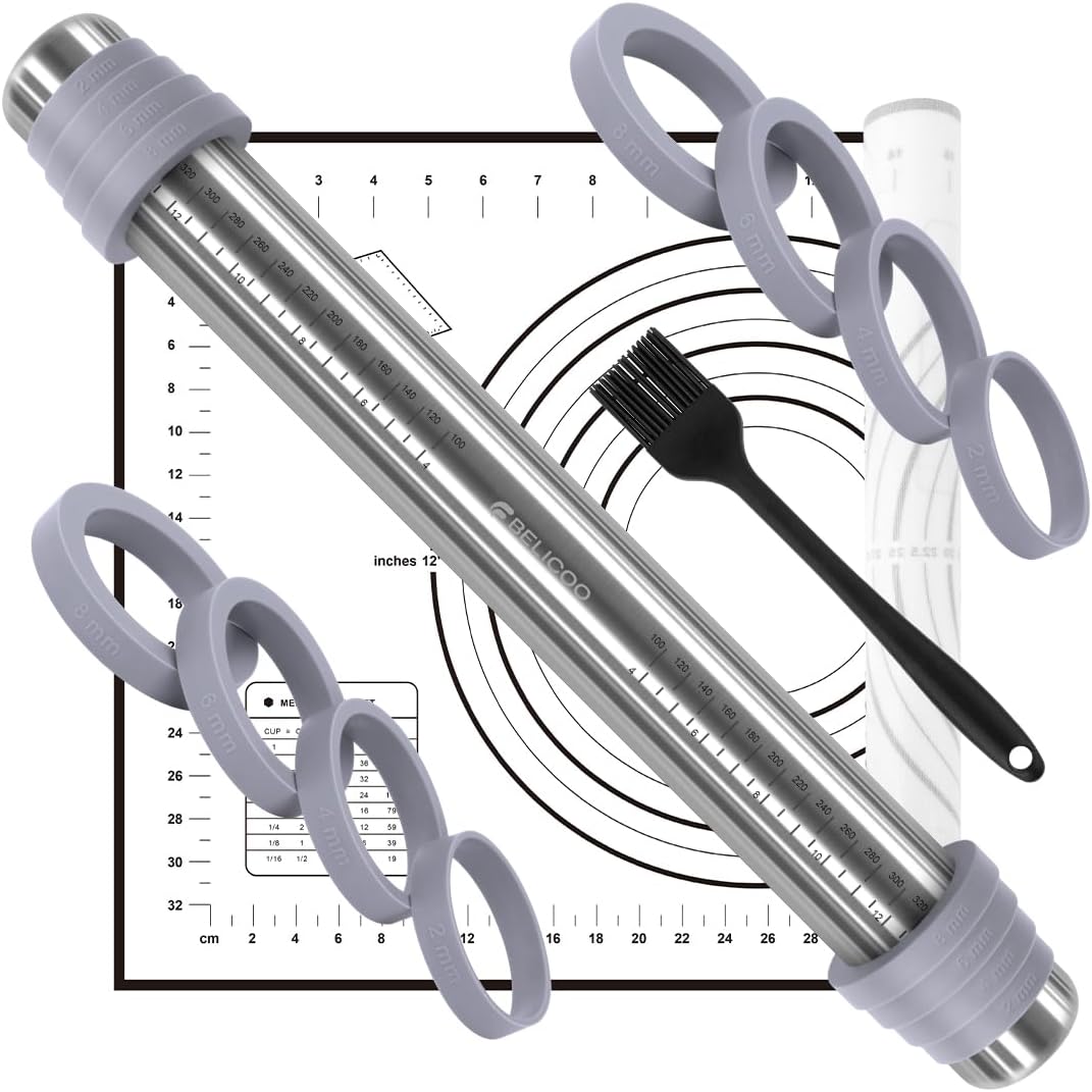 - 【Perfect Set】The set includes a 16.1-inch (40cm) food grade stainless steel rolling pin, four sizes (2mm/4mm/6mm/8mm) adjustable detachable rings, a silicone pastry pad with size, and a food grade silicone brush. A complete set of tools makes cooking and baking easier and more enjoyable for you.