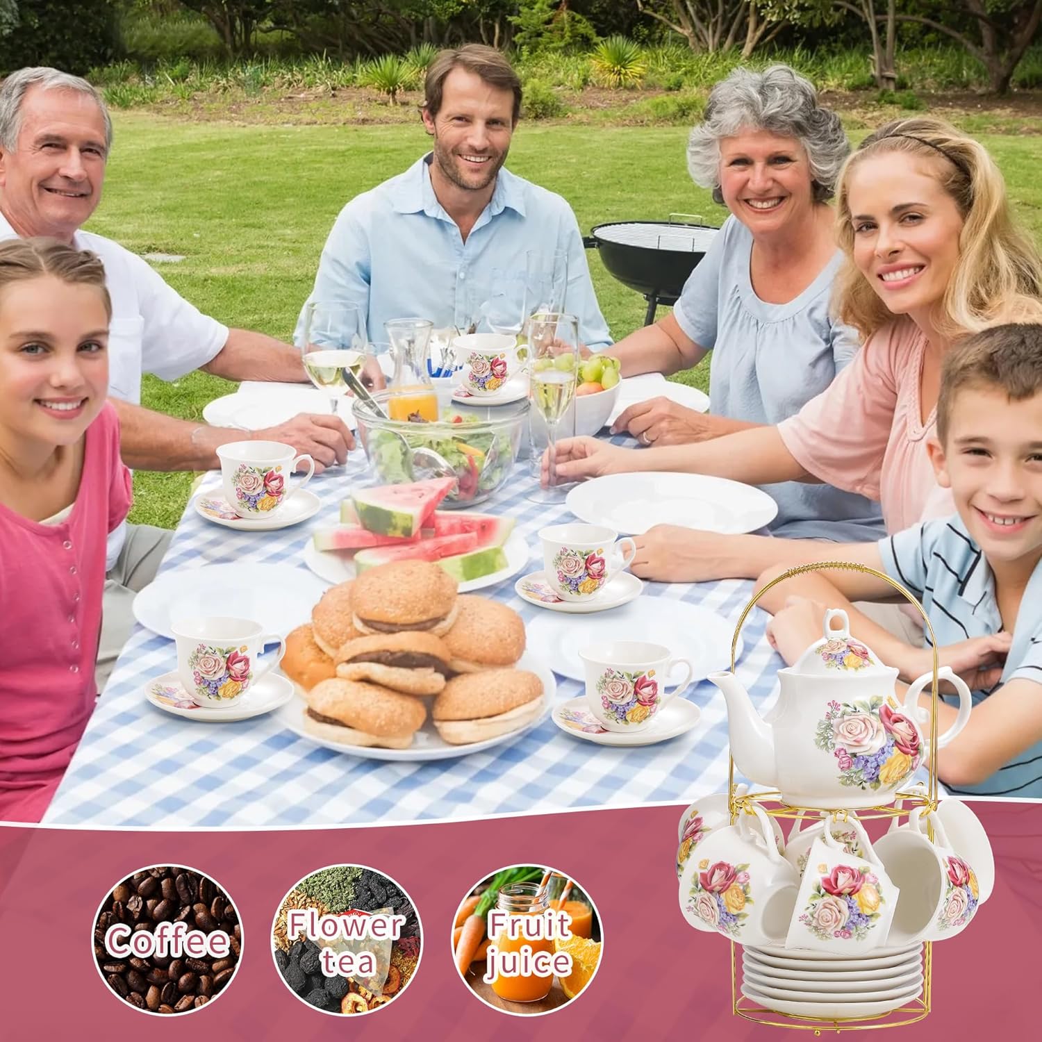 20-Pieces Porcelain Bone china Tea Sets,Gold Rim Coffee Set with Golden Metal Rack,Tea Gift Sets for Home&Party (006)