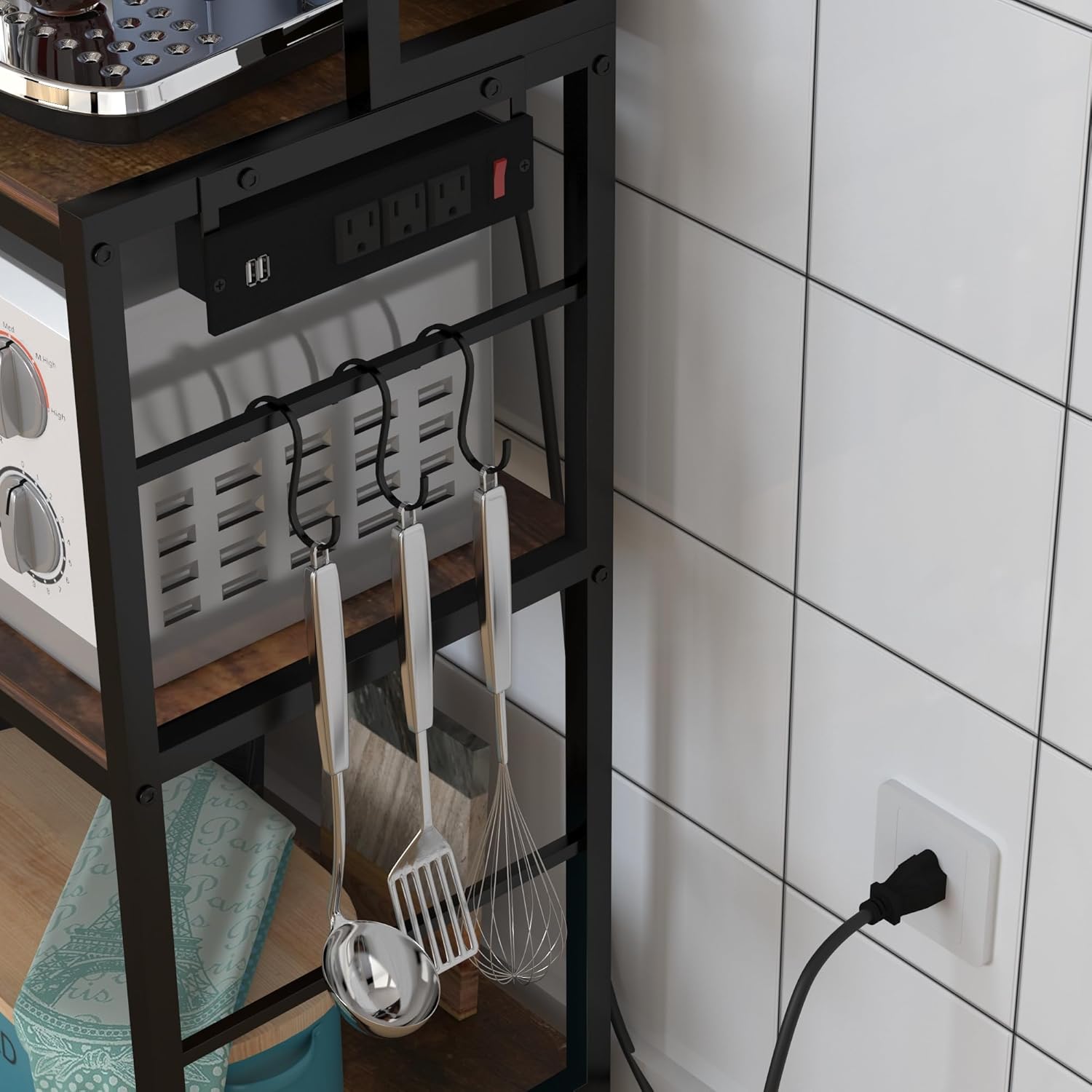 - 【Power Outlets】 This kitchen storage rack includes 3 power outlets,2 USB charging station and a switch button that can easily charge various small kitchen appliances. Help you say goodbye to messy socket wires!
