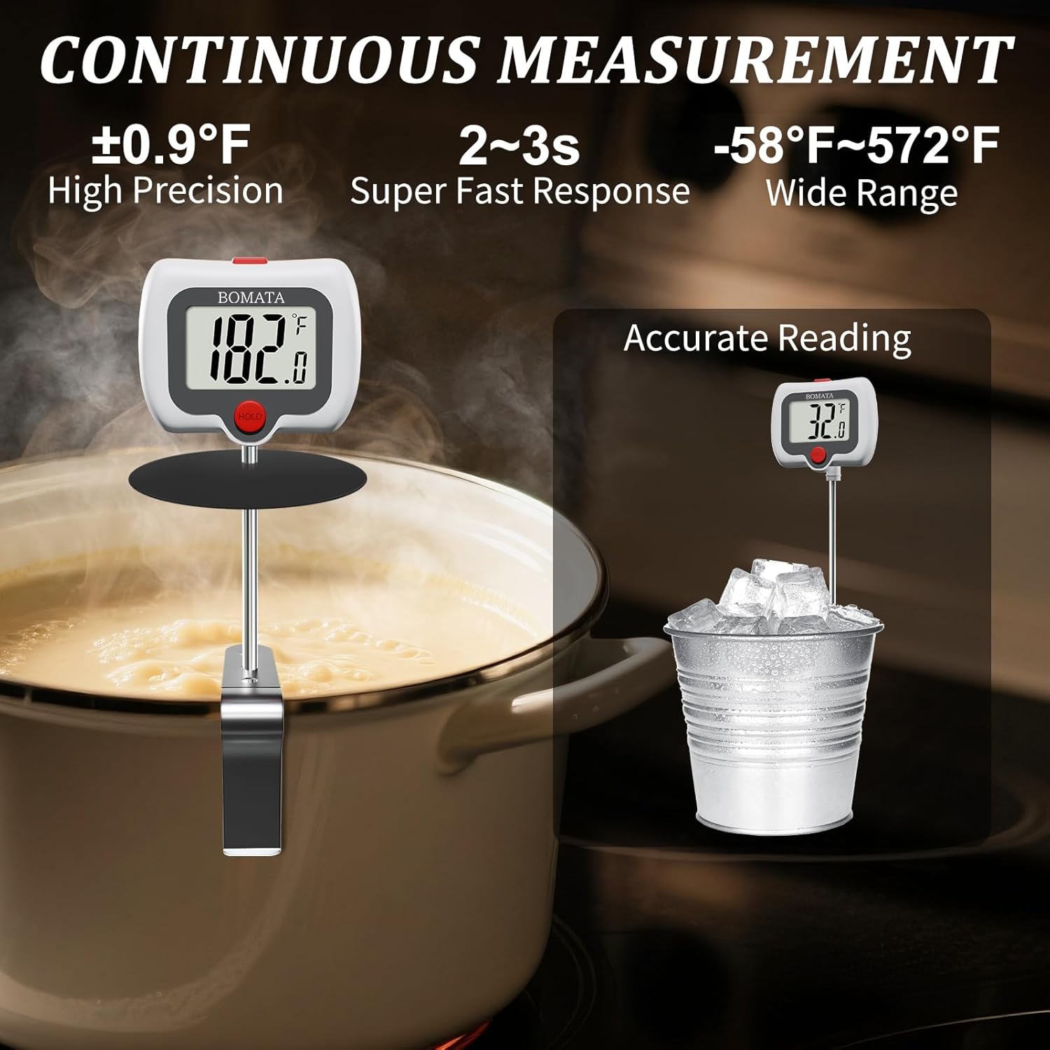 BOMATA Candy Thermometer with Pot Clip, Instant Read Cooking Thermometer with 8" Long Probe, Rotating Display, for Candy Making, Food, Candle Making, Liquids, Water, Baking, Sugar, Grilling. White