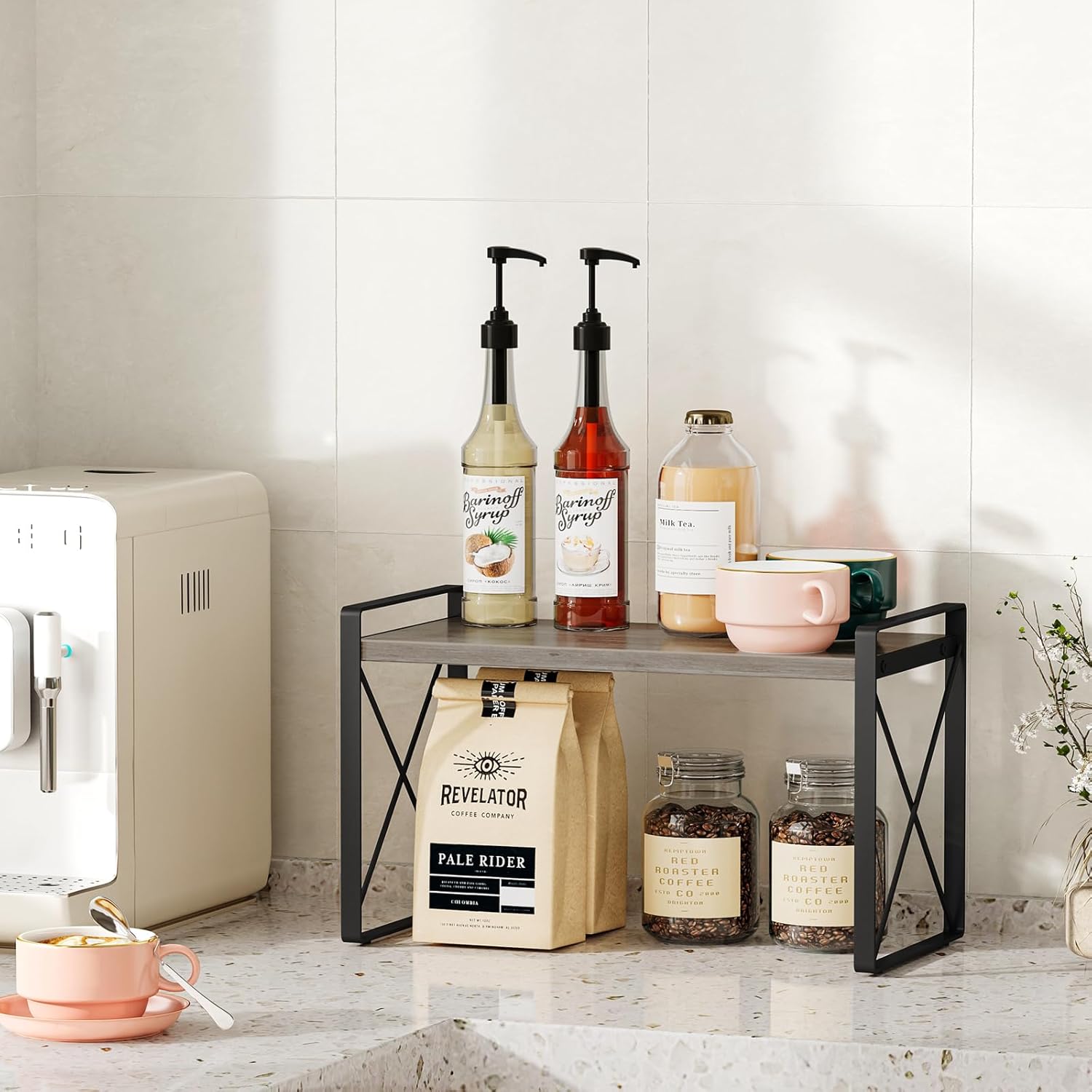 - 【Sturdy and Durable】The frames on both sides of the countertop shelf are made of sturdy metal, and the surface is treated with paint, which is not only beautiful but also rust-resistant. We use four metal rods to connect the opposite corners of the frames, greatly improving its load-bearing capacity and stability.