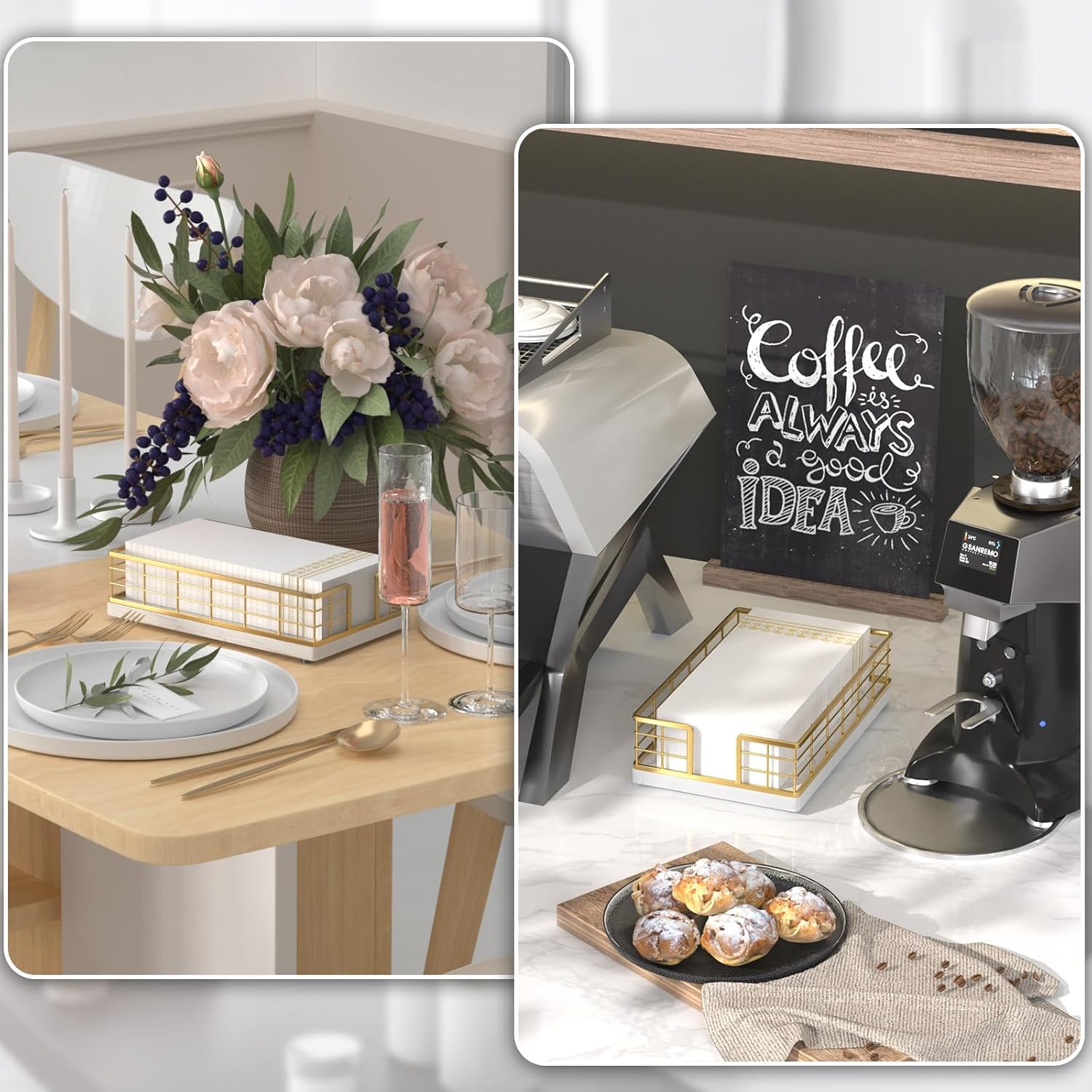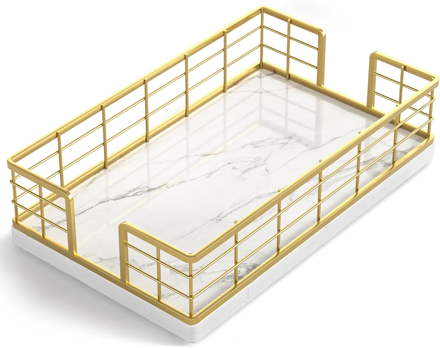 Wican Marble Guest Towel Holder Tray for Bathroom, Napkins Holder for Powder Room Dinning Table Wooden Basket for Disposable Paper Hand Towels Gold and Marble White