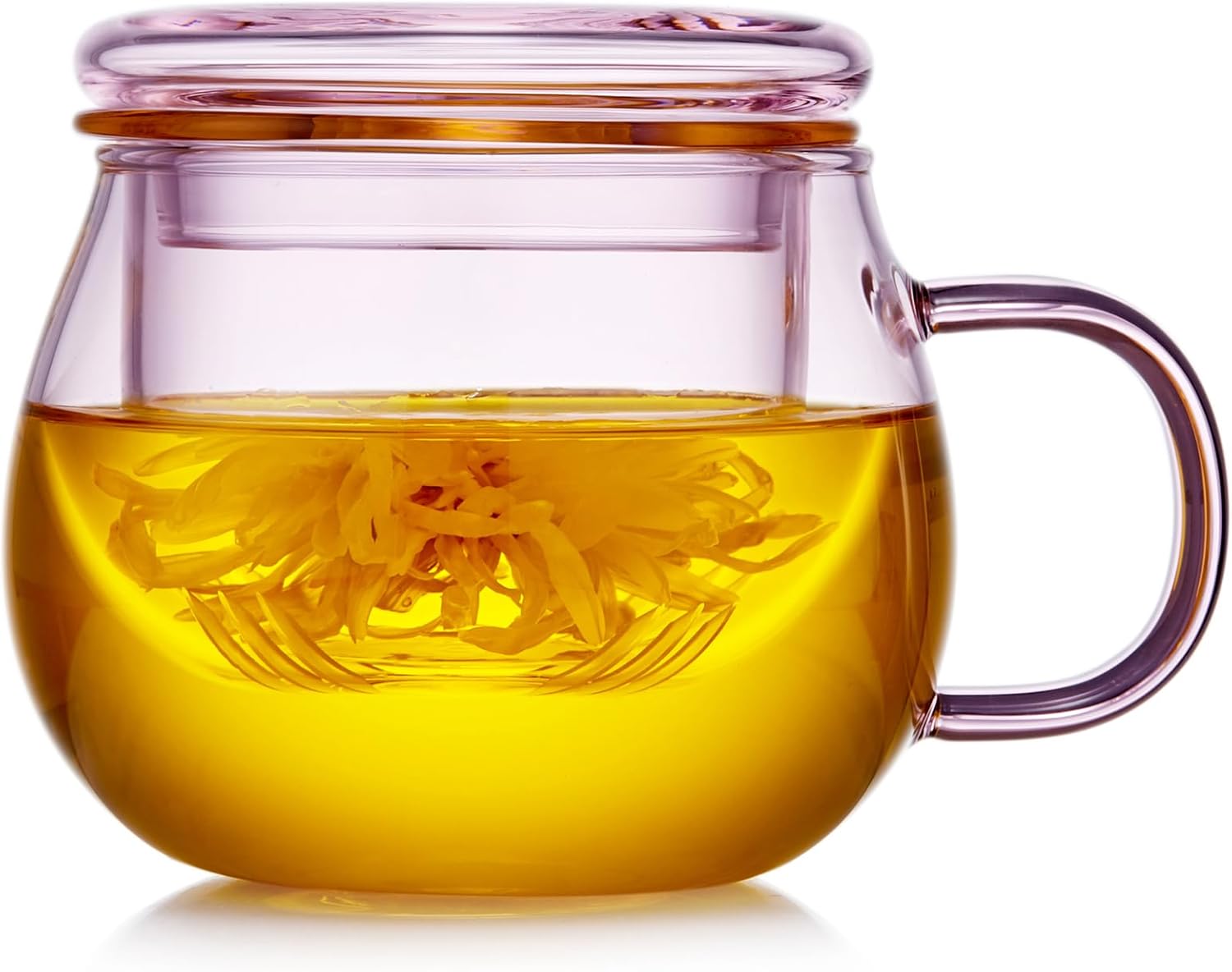 11oz Pink Glass Tea Cup with Infuser and Lid– Versatile and Elegant Gift for Women, Perfect for Loose Leaf Tea and Other Beverages