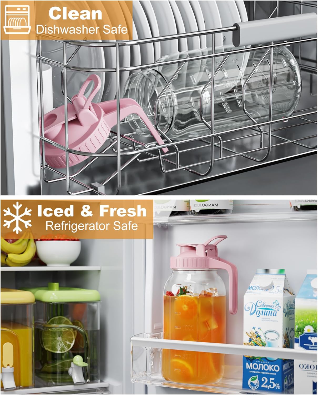 - Premium Quality Glass Jug - This glass water pitcher is made of great quality food grade glass,the sturdy glass material is not easy to break.The glass jar and lid are free of lead,cadmium and BPA and have no unpleasant odor to affect the taste of your drink.Can be stored in the refrigerator and can be washed in the dishwasher