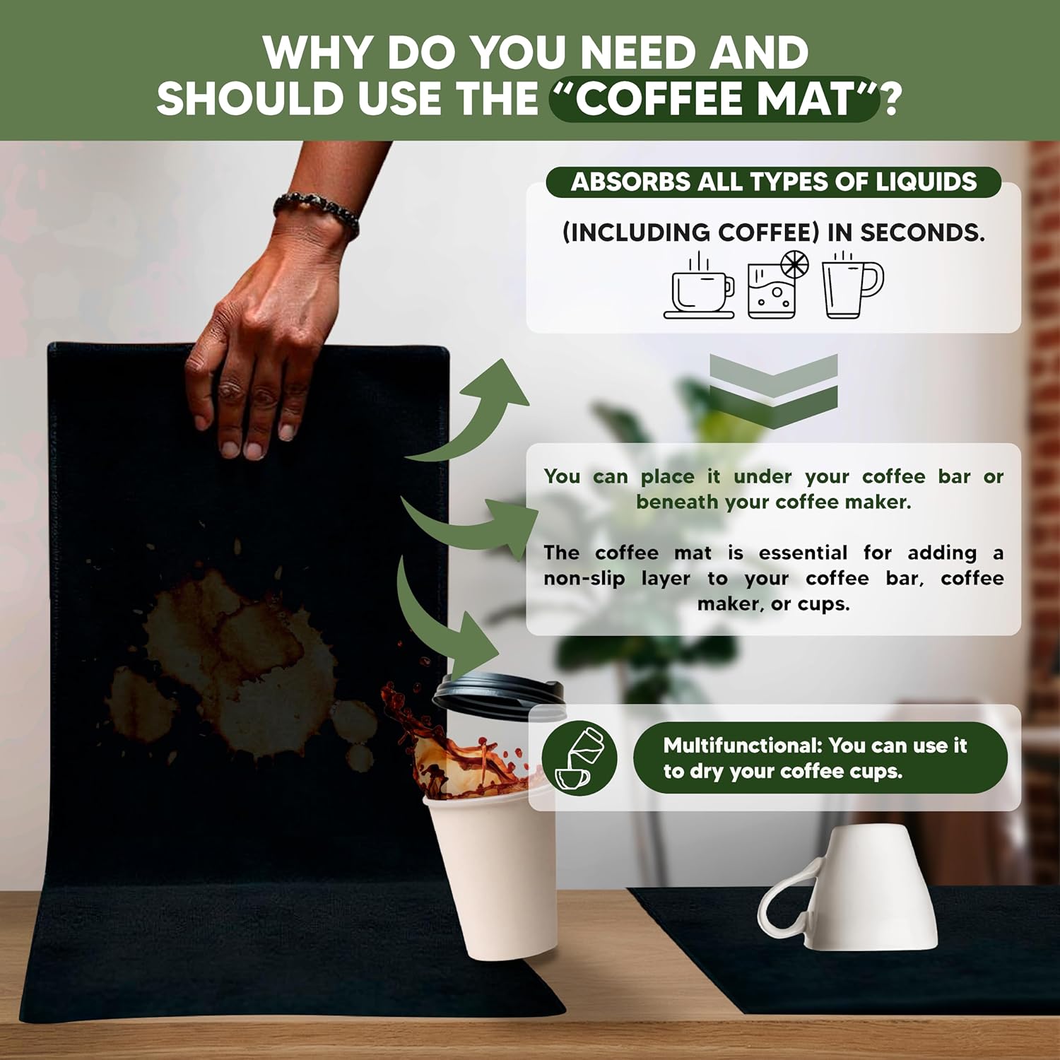 - š§¼ ENJOY A CLEANER, DRYER, MORE STYLISH SPACE: The ultra-absorbent silicone mat protects your counters from spills and adds a non-slip surface beneath your machine. Less mess, more peace of mindāand it even doubles as a drying pad for your favorite mugs.