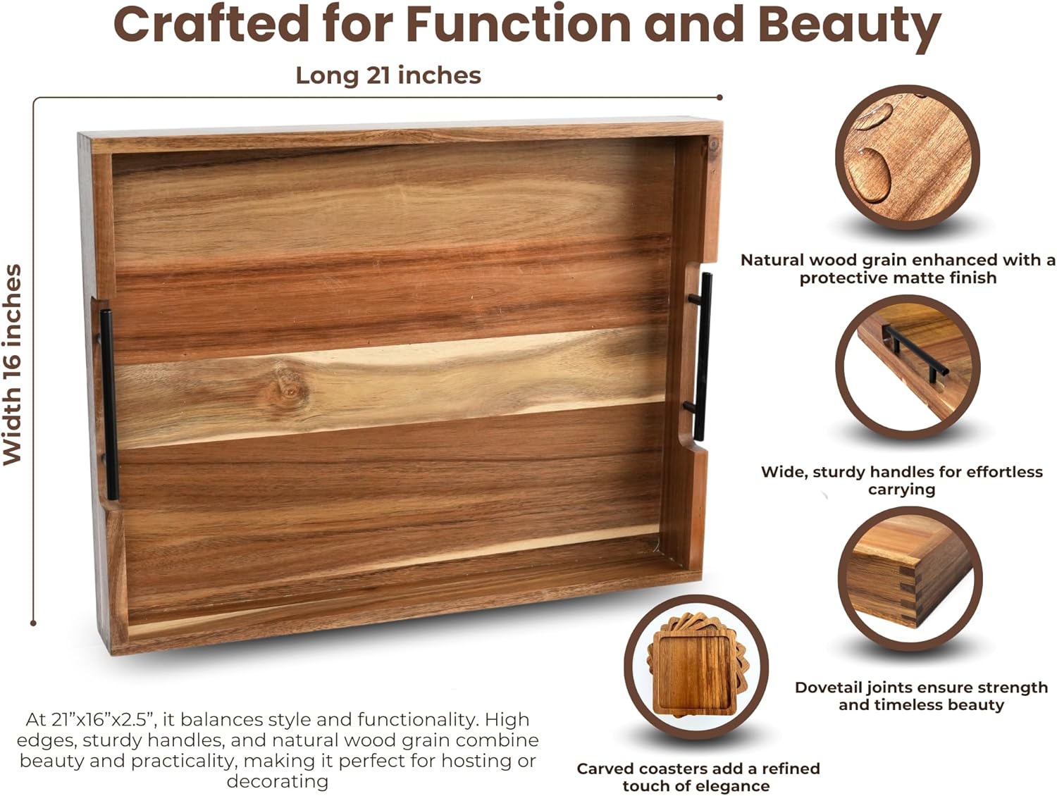 - Premium Acacia Wood: Each component is crafted from high-quality acacia, featuring a durable dovetail. Elegantly carved coasters highlight the importance of details, accentuating the natural beauty and durability of the wood. Enhances Any Home