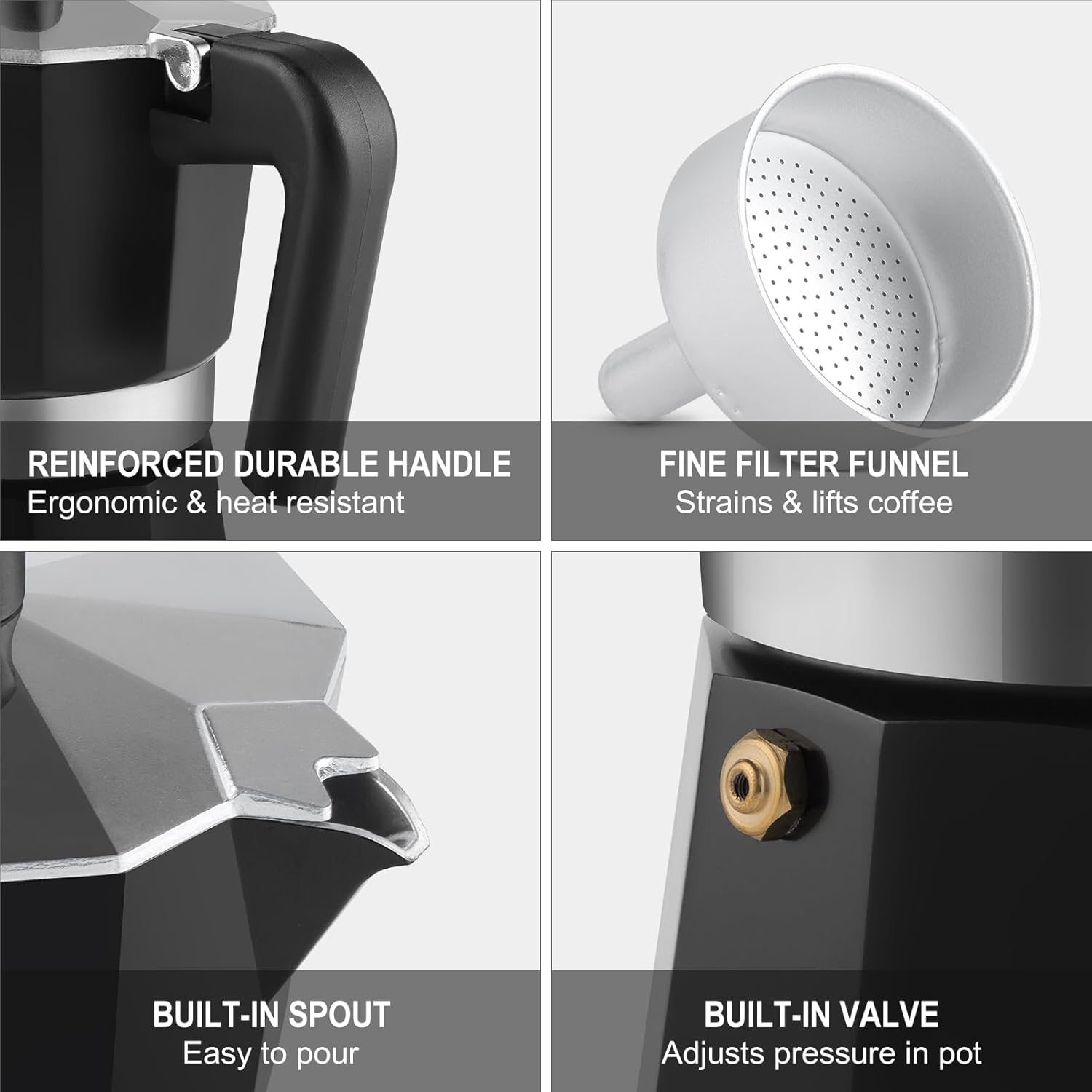 Sivaphe Aluminum Moka Pot 9 Espresso Cups, Percolator Espresso and Coffee Maker, Portable Stovetop Italian and Cuban Café Brewer for Home and Camping Black