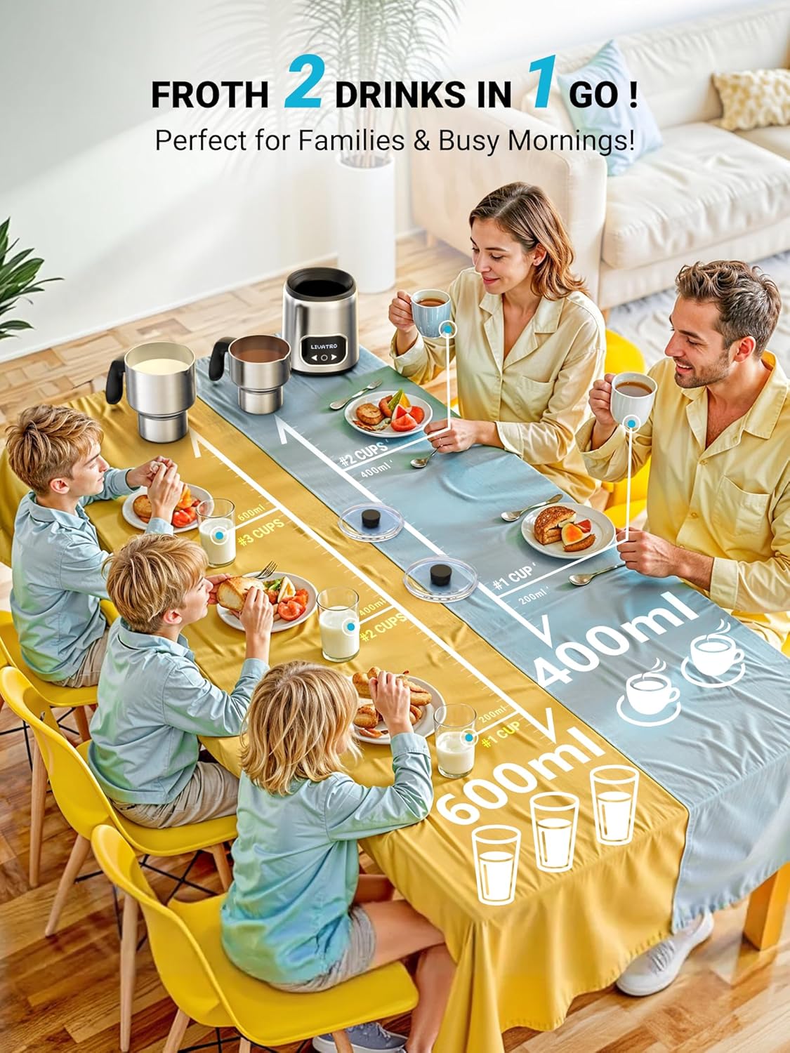 - ๐๐ฎ๐๐ฅ ๐๐ฎ๐ฉ๐ฌ ๐๐จ๐ซ ๐๐ฎ๐ฌ๐ฒ ๐ ๐๐ฆ๐ข๐ฅ๐ข๐๐ฌ: The milk frother and steamer allows you to effortlessly switch between 21oz (4 servings) and 13.5oz cups, ensuring everyone's preferred foam without flavor crossover and no need for cleaning in between. Ideal for busy mornings, families, and coffee lovers.