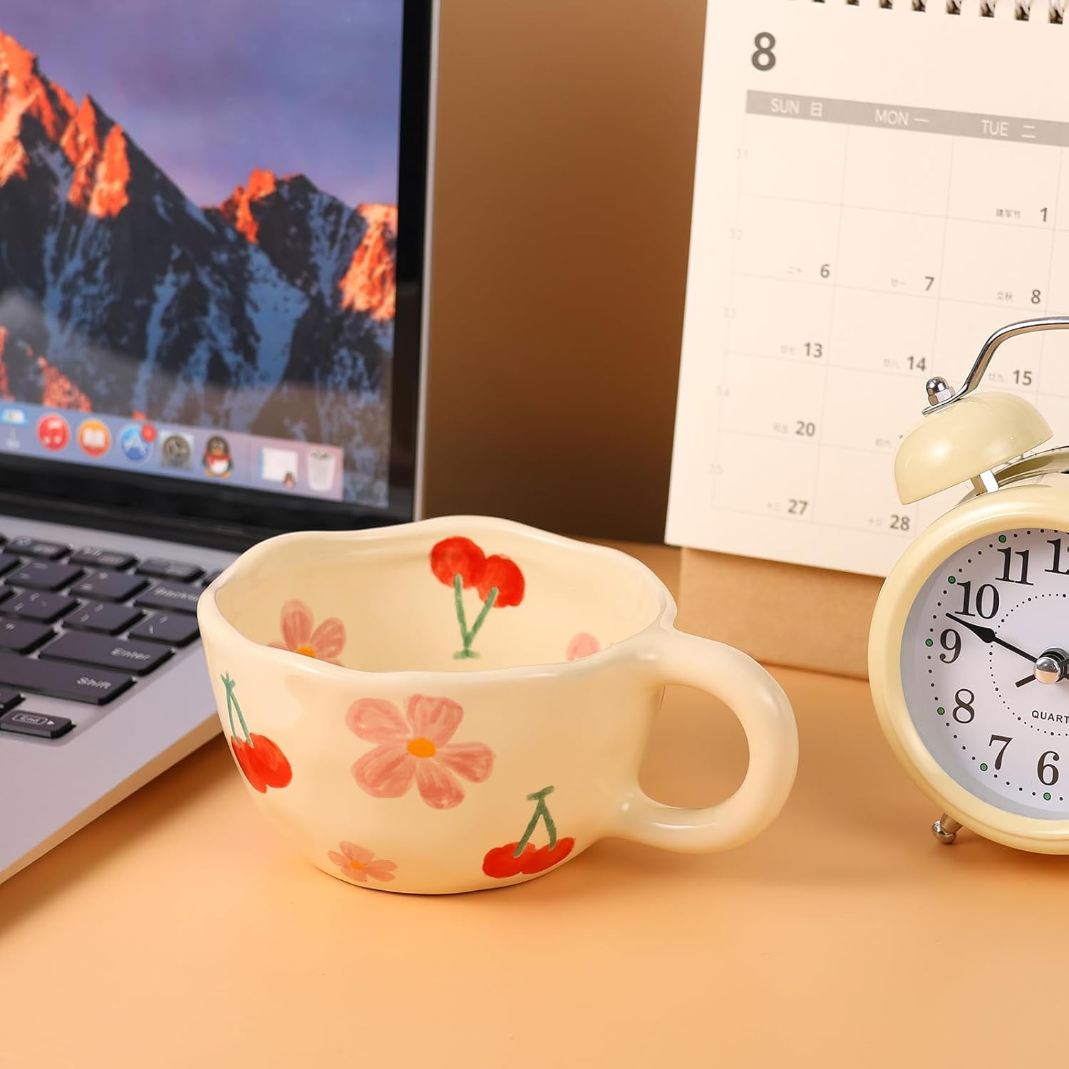 Ceramic Coffee Mug Vintage Flower Mugs 8 oz Cute Floral Coffee Mugs Irregular Latte Art Cup Lead-free Porcelain Cups for Cappuccino, Cocoa (Pink Cherry)