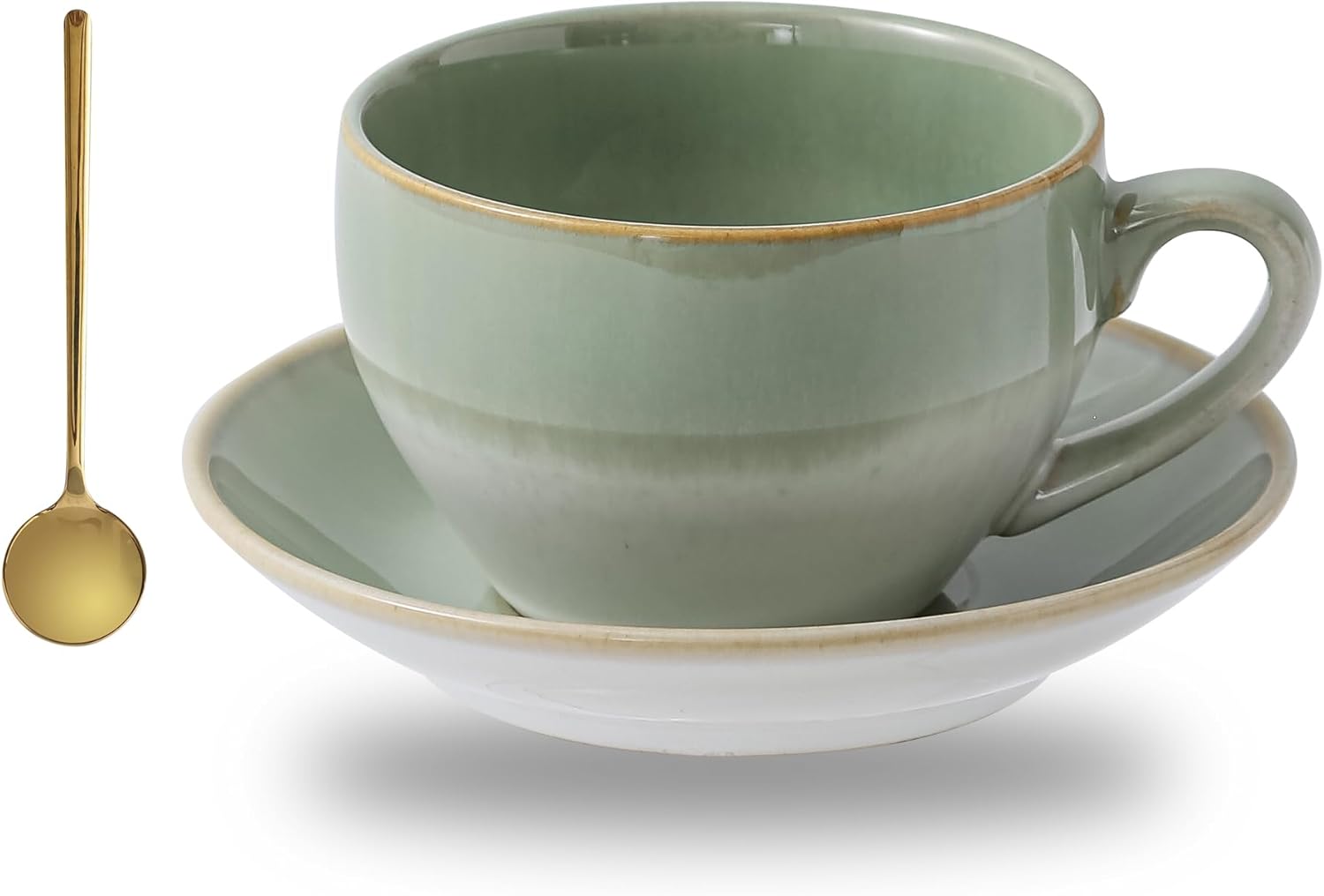 - The package includes cup + saucer + coffee spoon(White both green). The cup's full capcity torRim 11 oz for latte art use or tea. Professional cup shape serves latte art/cappuccino/Americano.