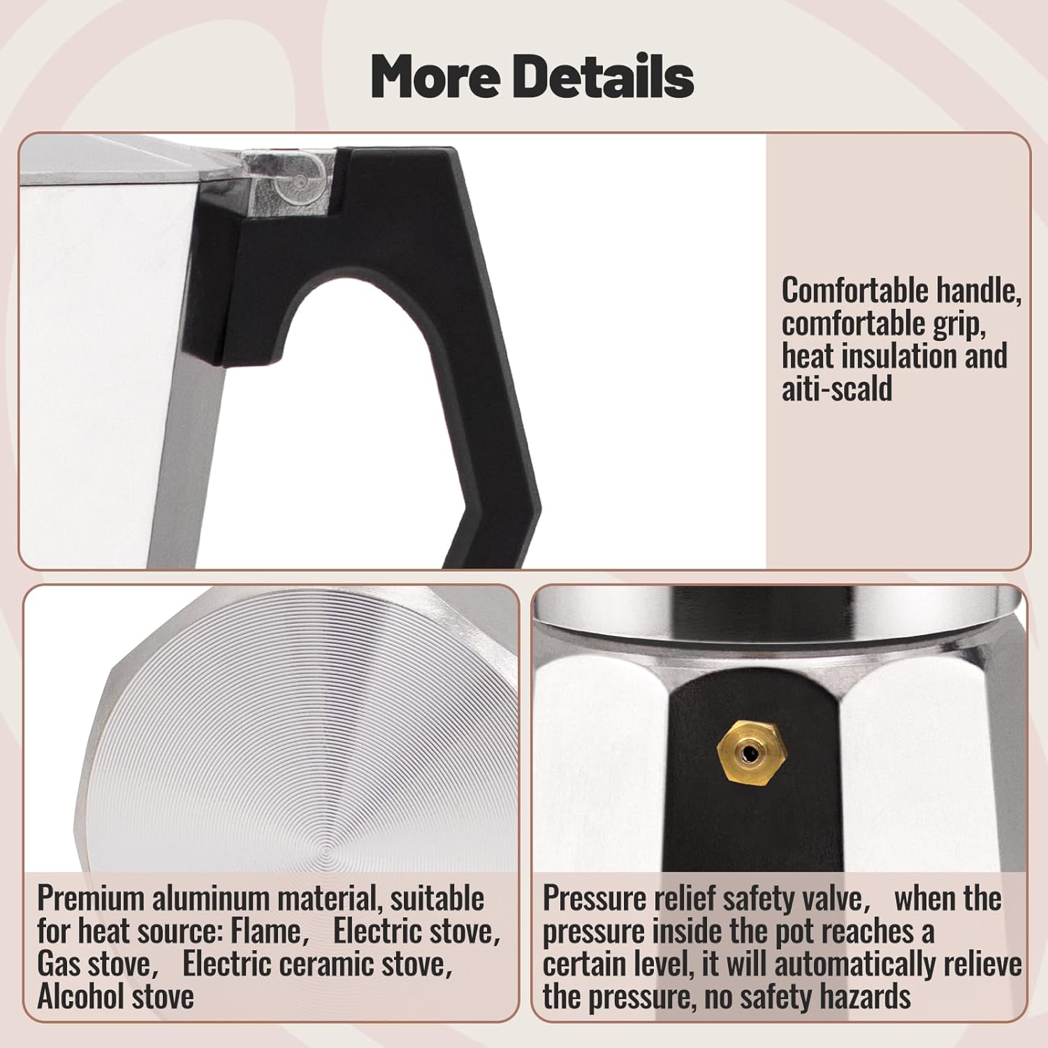 - Robust Durability: Crafted meticulously from high-quality cast aluminum, our moka pot is built to last. Experience the ultimate durability and enjoy thorough heat distribution for an enhanced coffee flavor, captivating aroma, and consistent results. The lid with a heat-resistant knob and handle ensures safe and effortless pouring