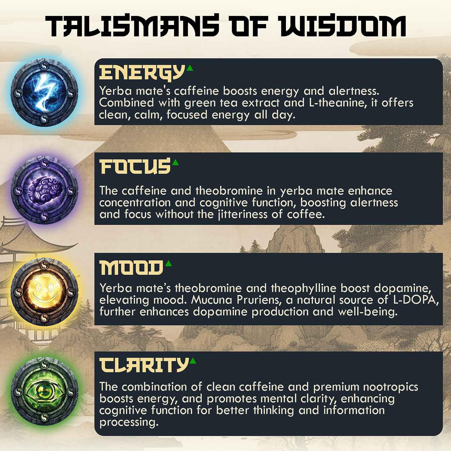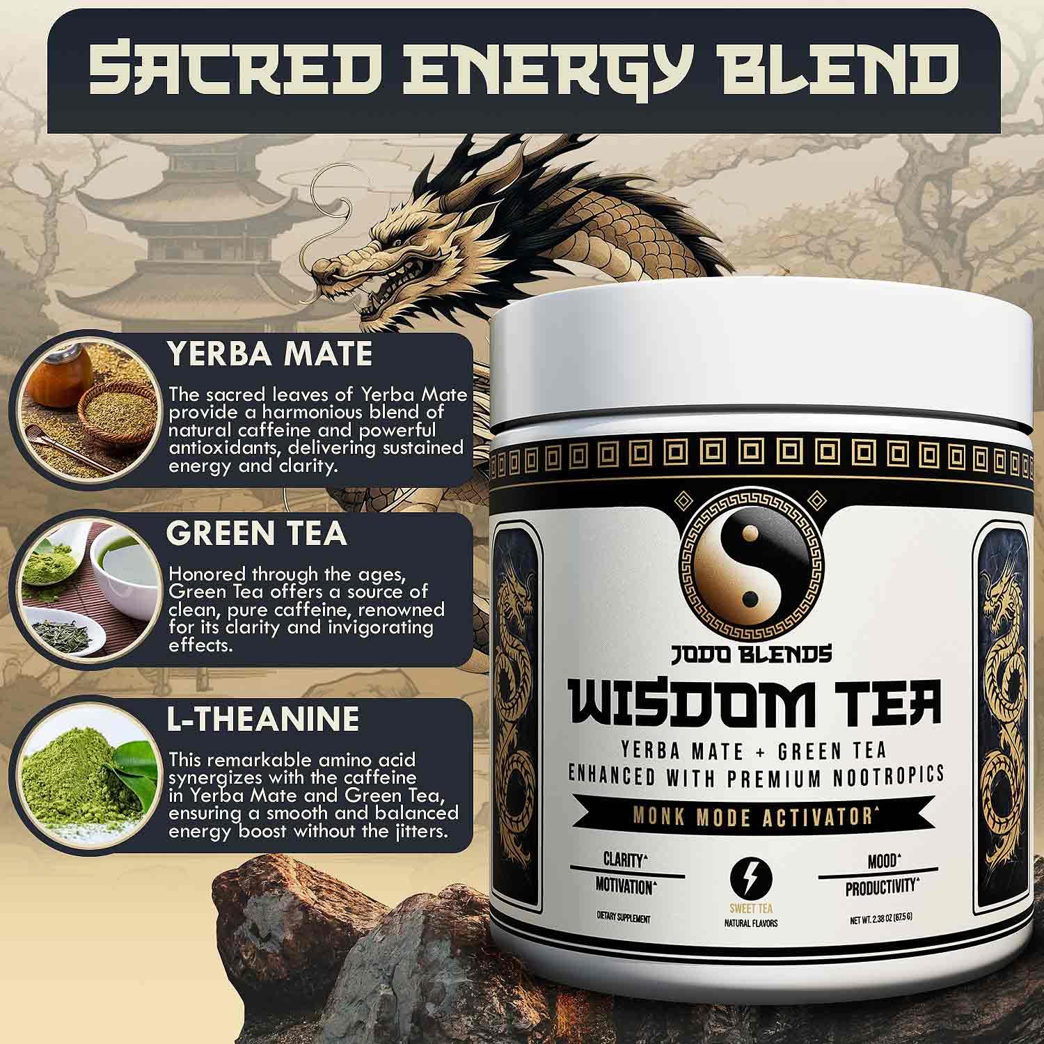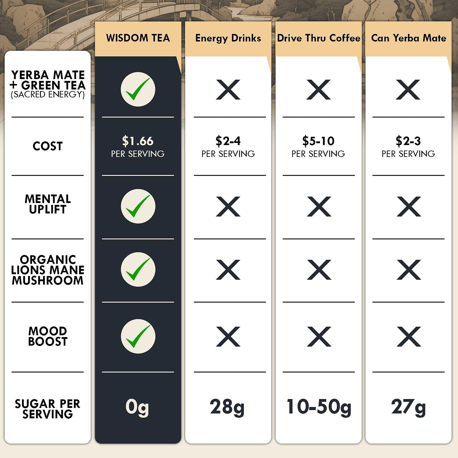 - CLEAN ENERGY WITHOUT THE CRASH: Powered by Yerba Mate, Green Tea and L-Theanine, Wisdom Tea delivers smooth, sustained energy without the jitters of coffee or the crash of energy drinks. Feel sharp, calm, and focused - all day.