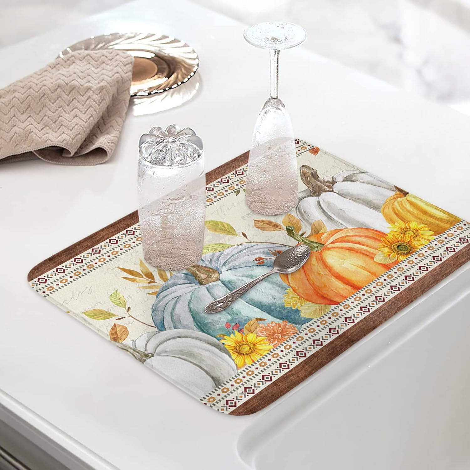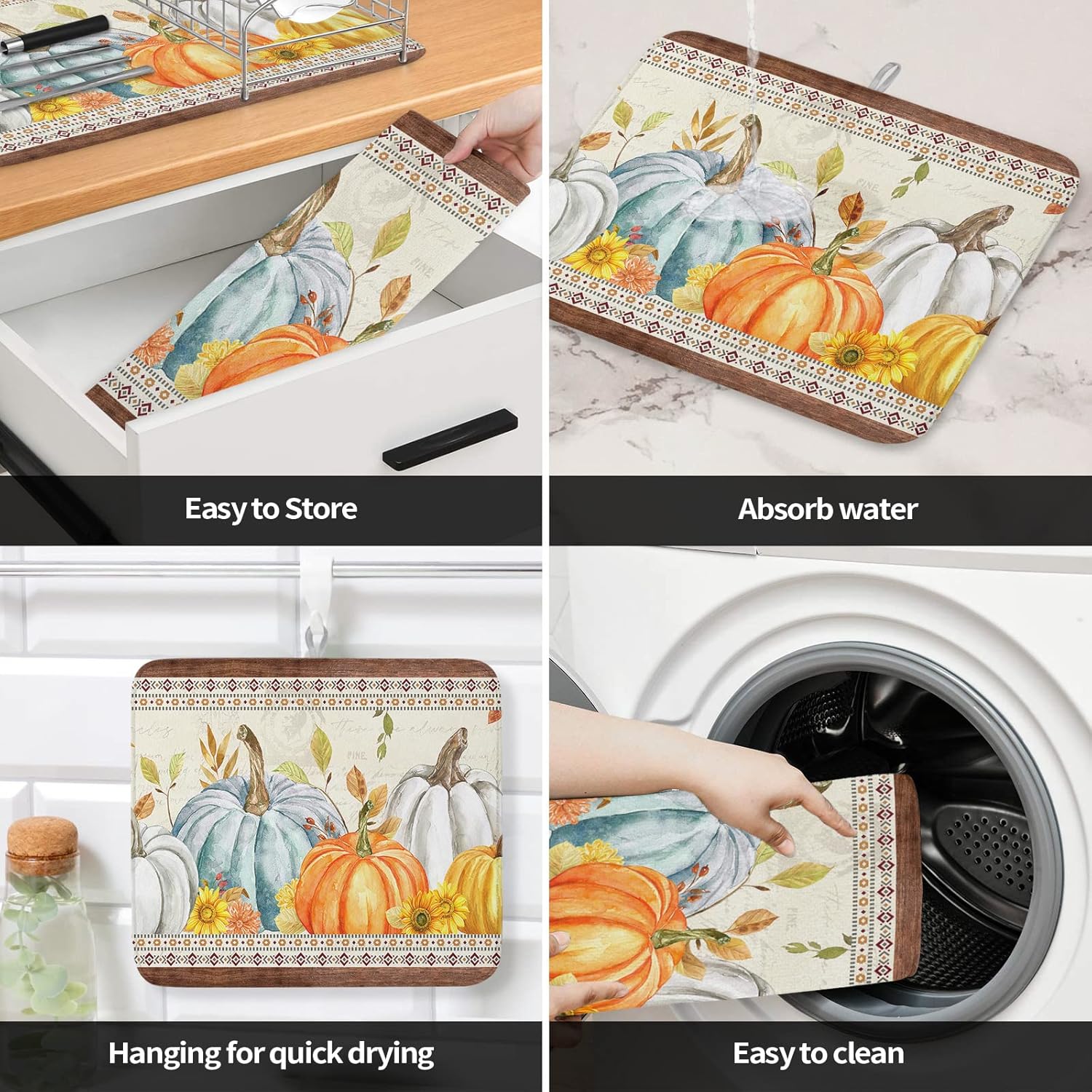 Fall Dish Drying Mat for Kitchen Counter Pumpkin Drying Pad Absorbent Drying Mats for Countertops Sinks Draining Racks Sunflower Eucalyptus Leaves Drainer Holiday Harvest Thanksgiving Decor 18x24