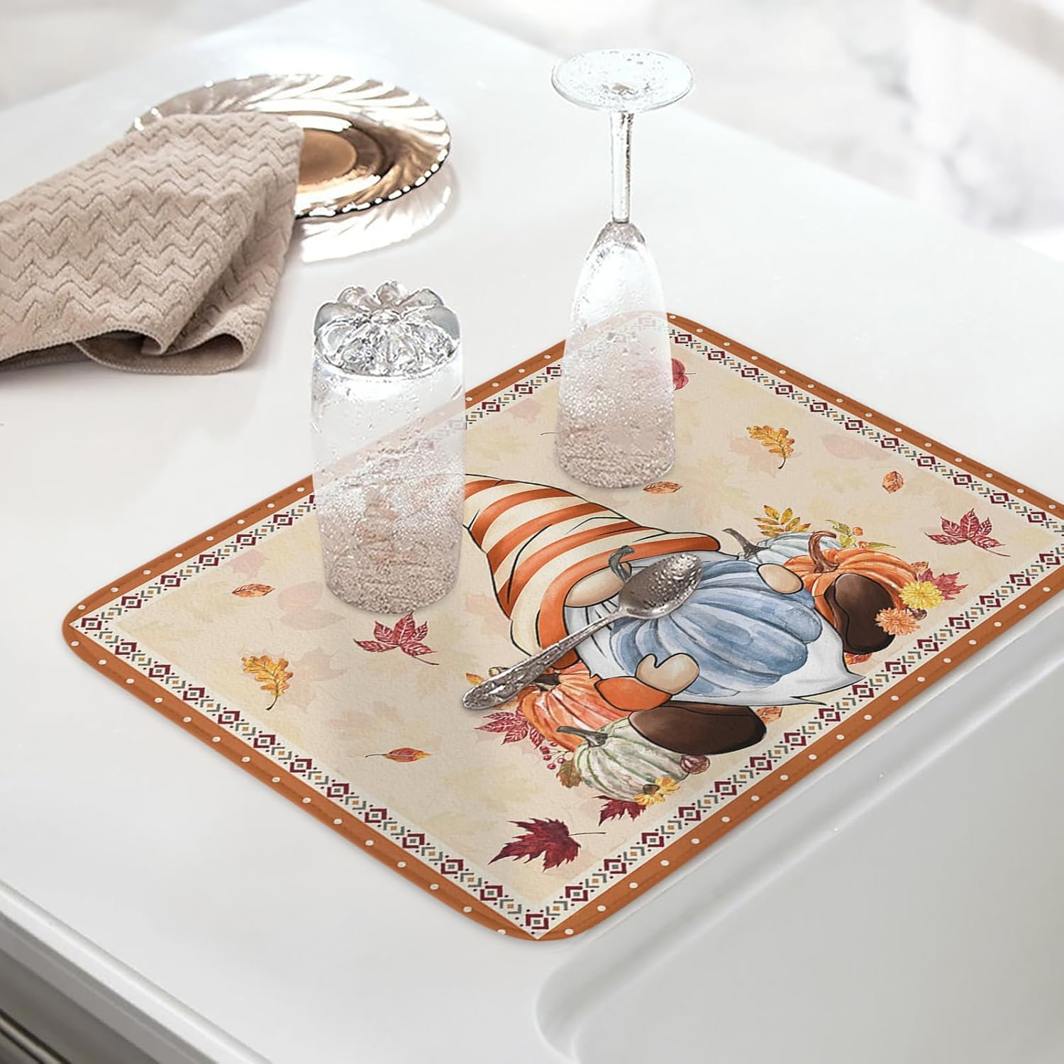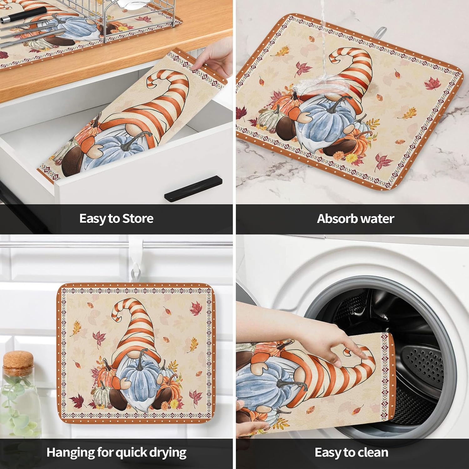 - Fall & Thanksgiving Decor - Pumpkin with gnome drying mats can add an chic holiday vibe and charm to your kitchen or coffee bar counter. The drying mat for kitchen counter with a unique hanging rope design that can be hung without occupying any space.