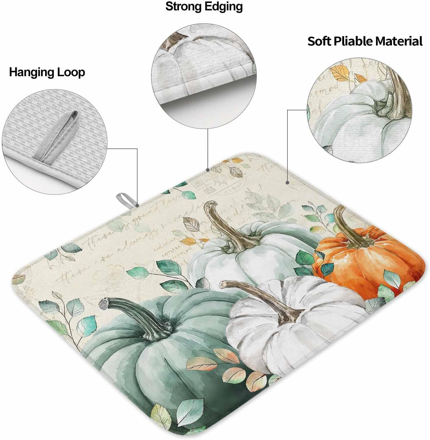 Fall Dish Drying Mat for Kitchen Counter Green Pumpkin Drying Pad Absorbent Drying Mats for Countertops Sinks Draining Racks Eucalyptus Leaves Drainer Holiday Harvest Thanksgiving Decorations 16x18