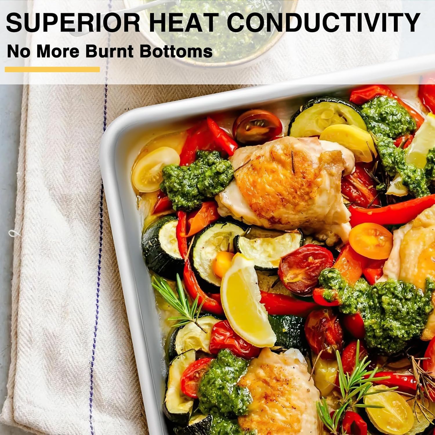 - NO MORE BURNT BOTTOMS: They perform better than ordinary stainless steel baking pans in terms of heat resistance and cook everything evenly, withstand temperatures of up to 500ºF / 260ºC without warping. Foods bake evenly due to aluminum’s superior heat conductivity