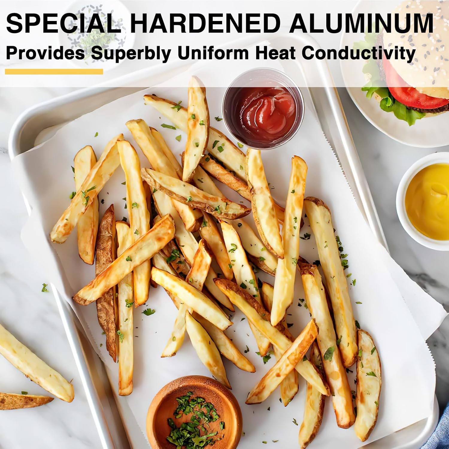 - PURE UNCOATED ALUMINUM & SUPERIOR HEAT CONDUCTION: Crafted from 100% bare aluminum with NO chemical coatings – guarantees safe, toxin-free cooking. Engineered for lightning-fast, even heat distribution (up to 30% faster than steel!) for perfectly crispy cookies, golden roasted veggies, and juicy meats every time. The aluminum baking pans are made of thick and heavy aluminum, with a heavy rolled edge making this truly "commercial-grade"that provides maximized scratch resistance