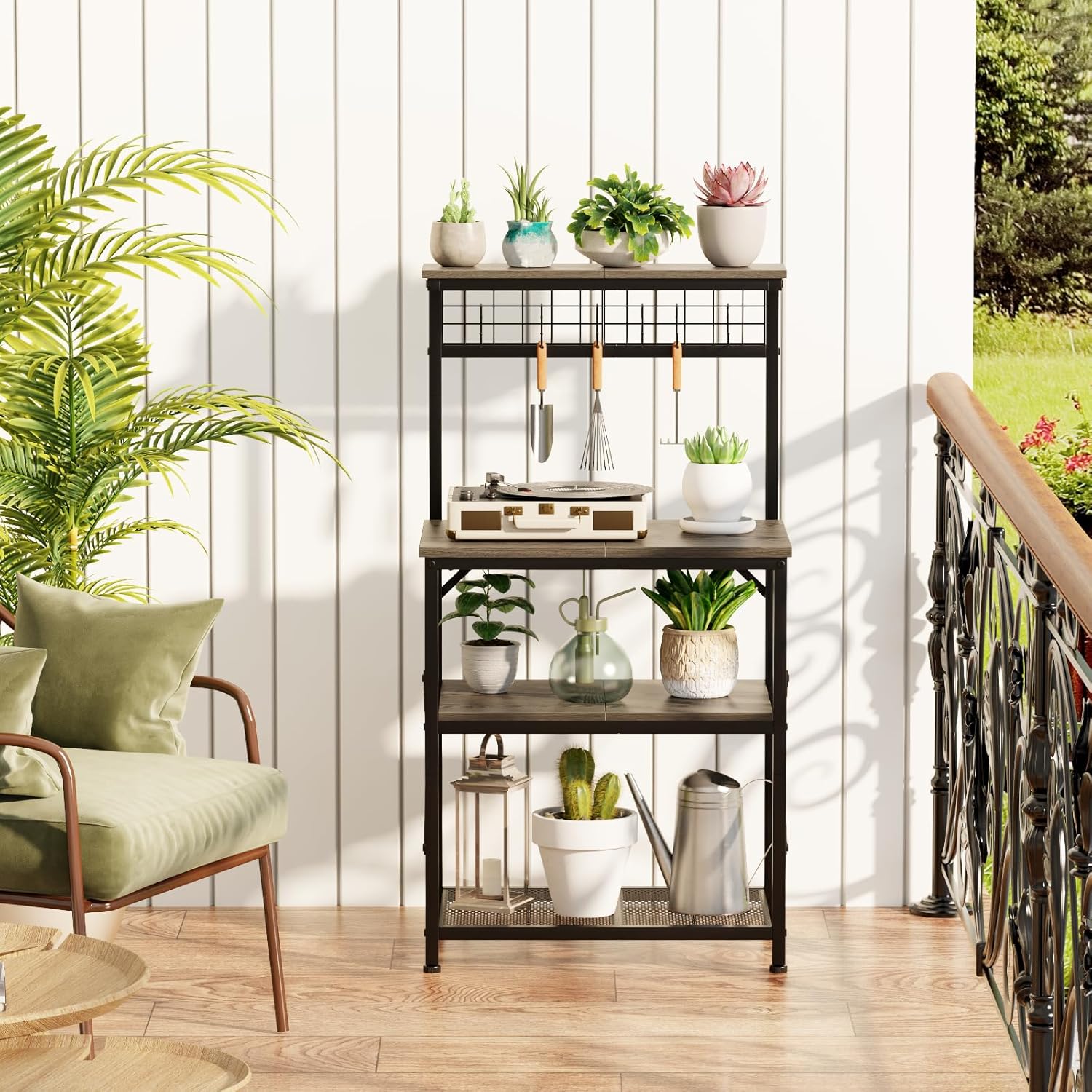 Furologee Kitchen Bakers Rack, Microwave Stand with Storage 4 Tiers, Coffee Bar Station with 6 S Hooks and Pegboard, Kitchen Shelves Rack for Spices, Pots, Black Oak