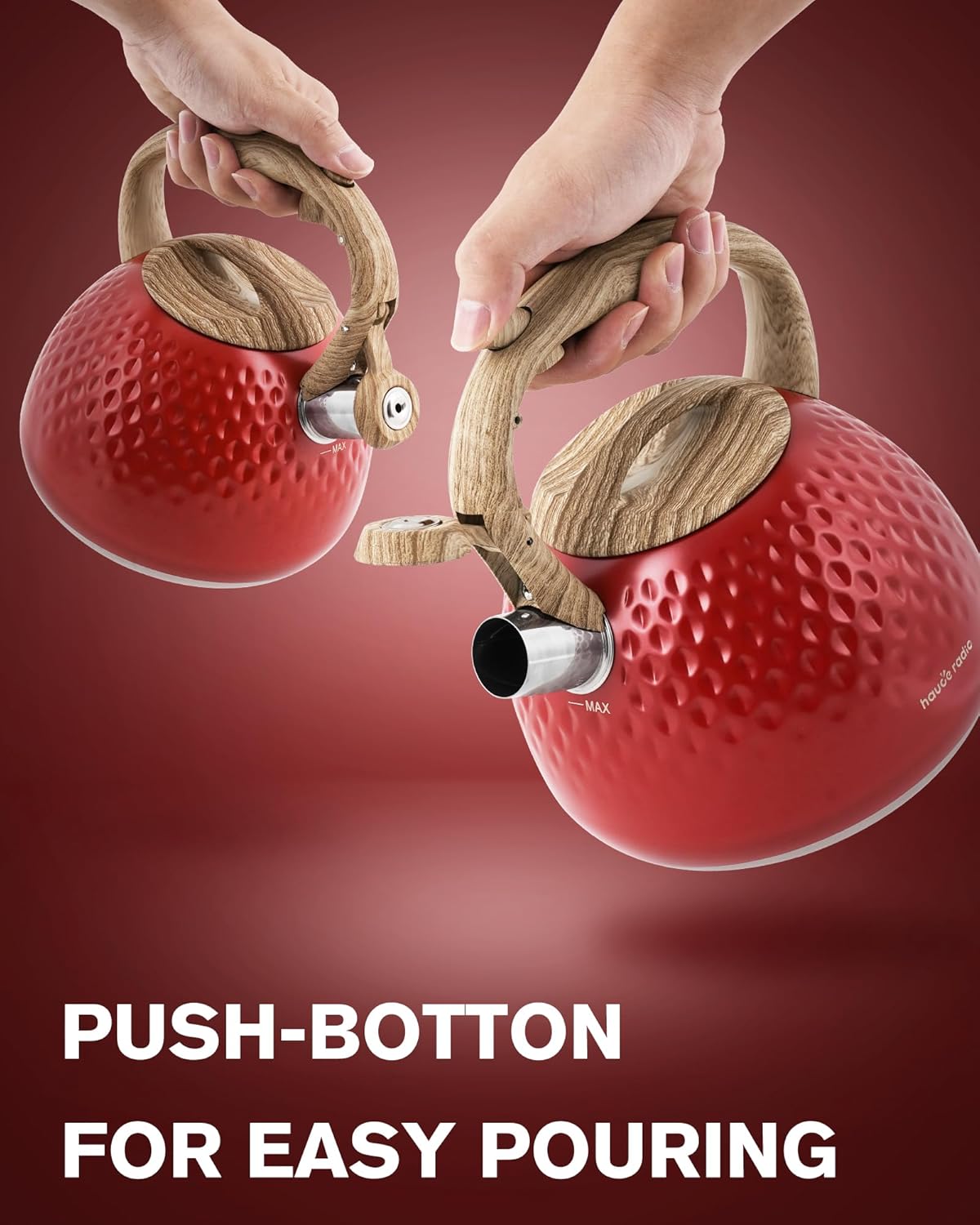 - Loud Whistle: This teapot kettle has a tight-fitting lid that keeps steam in the hot teapot for quick heating, and the teapot will whistle to remind you after boiling water. Do not overfill the jug or the whistle may not sound