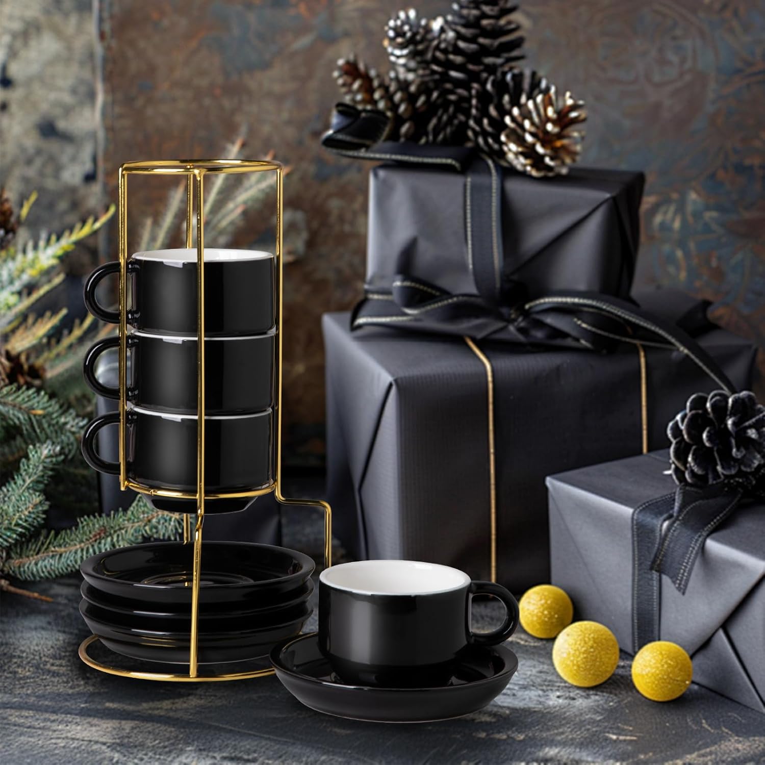 Sweejar Porcelain Espresso Cups with Saucers, 4 Ounce Stackable Cappuccino Cups with Metal Stand for Coffee Drinks, Latte, Tea - Set of 4 (Black Gold Stand)