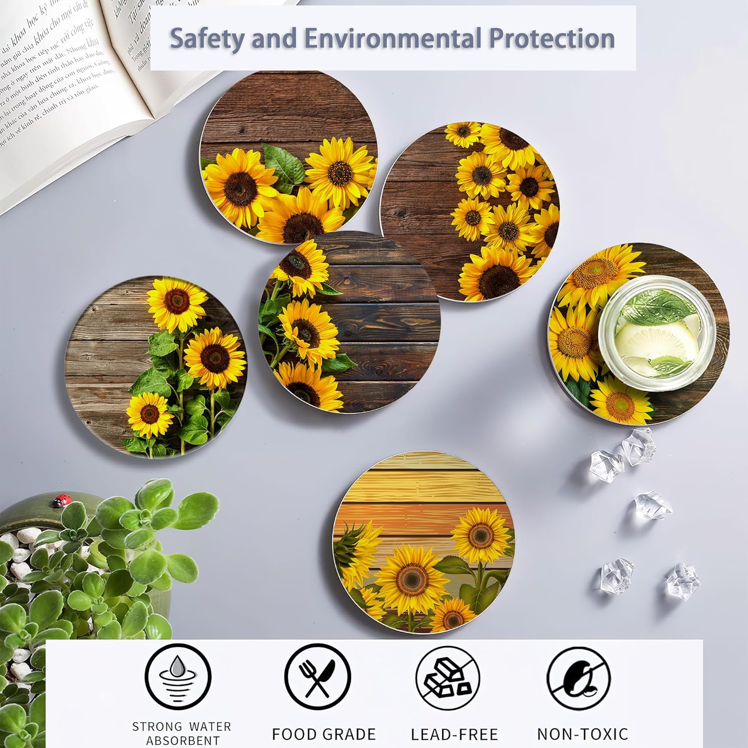 - Husiti Ceramic Coasters Set With Metal Holder: Keep Your Dining Table Stylish And Organized With This Set Of 6 4-Inch Round Coasters Featuring a Trendy Vintage Sunflower Wood Pattern.