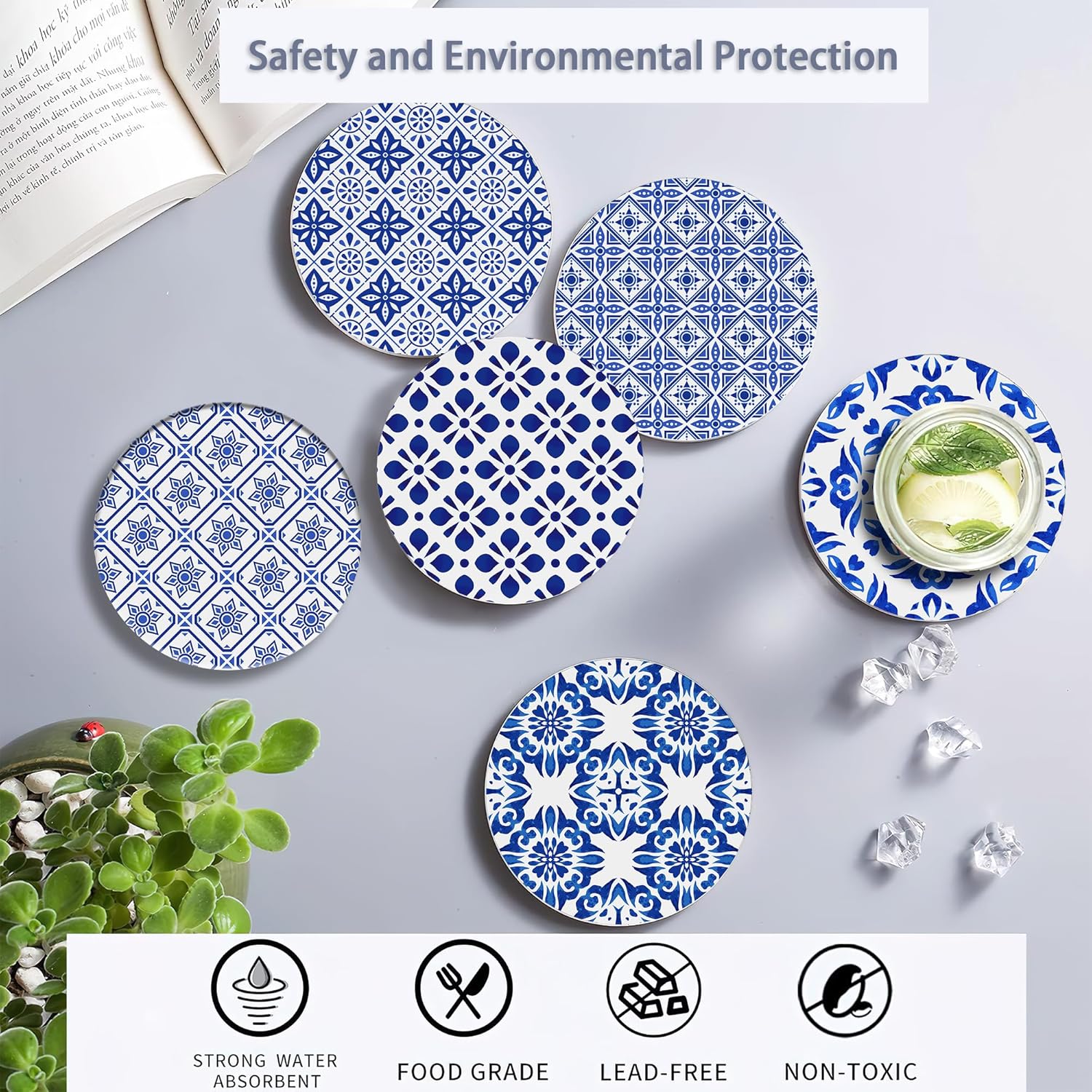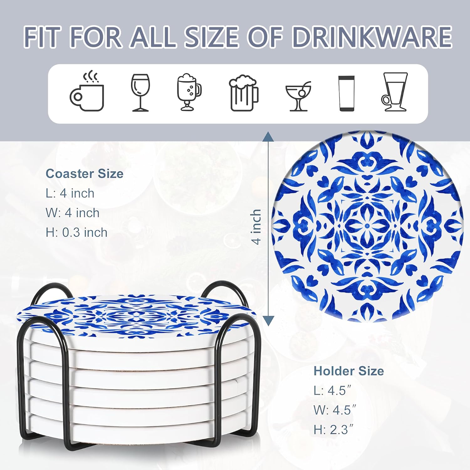 Drink Coasters Set of 6 with Holder, Handpainted Blue Pattern Absorbent Ceramic Coasters with Cork Base,Fit All Cups,Great Gift for Housewarming,Room Decor,Bar,Holiday Party