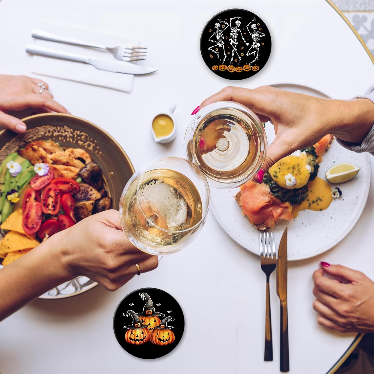 Coaster for Drinks Set of 6, Halloween Skeleton Skull Pumpkin Absorbing Round Ceramic Stone Coaster with Cork Base,Tabletop Protection Mat for Mugs and Cups,Coffee Table Wine Glass Home Bar 4 Inch