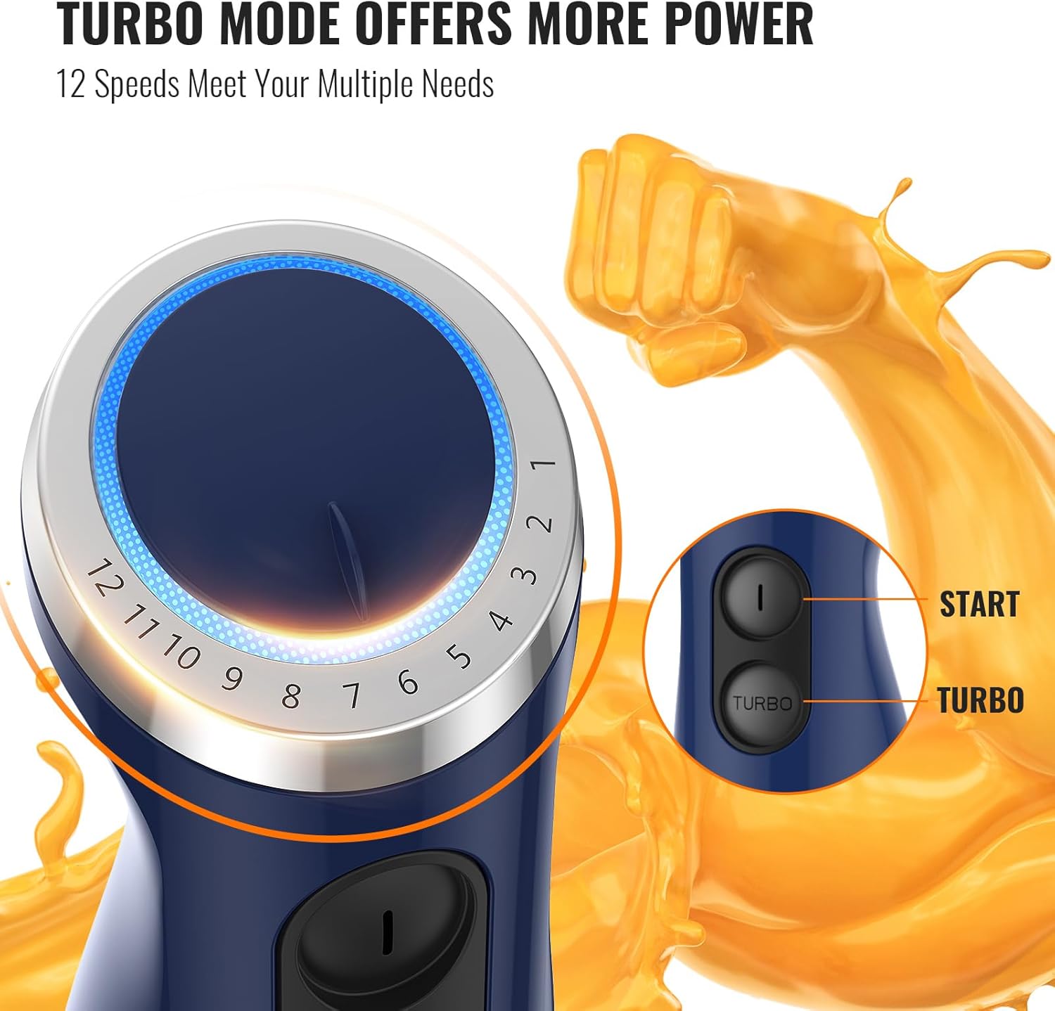 - 12 Speed & Turbo Boost ā The immersion blender comes with 12 adjustable speed and Turbo boost,will meet your multiple needs to make smoothies,soups,whip cream,and much more.With the Turbo Button for maximum speed,you can chop meat and nuts easily in seconds.