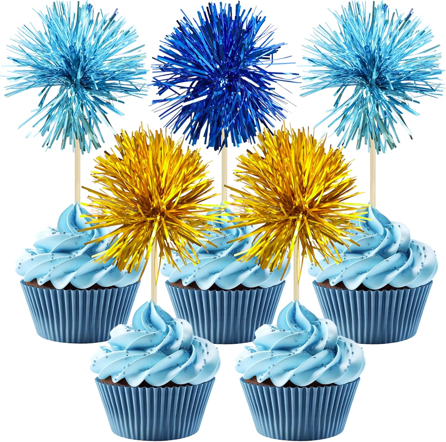 Gyufise 30Pcs Foil Firework Cupcake Toppers Sparkle Tinsel Cake Toppers Tinsel Drink Cake Decoration Cocktail Picks for Birthday Wedding Graduation Party Supplies Gold Light Dark Blue