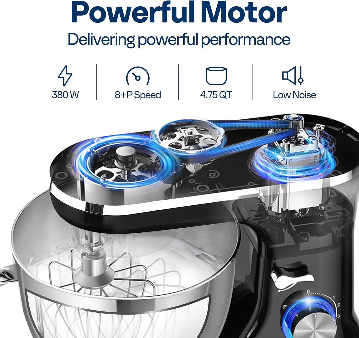 - POWERFUL MOTOR: Equipped with a high-performance 380-watt motor, this stand mixer ensures effortless and consistent whipping, beating, kneading, and thorough mixing; The all-metal gears provide stability and quiet operation (noise level ⤠76dB); The planetary mixing design moves the beaters around the bowl for even and thorough mixing