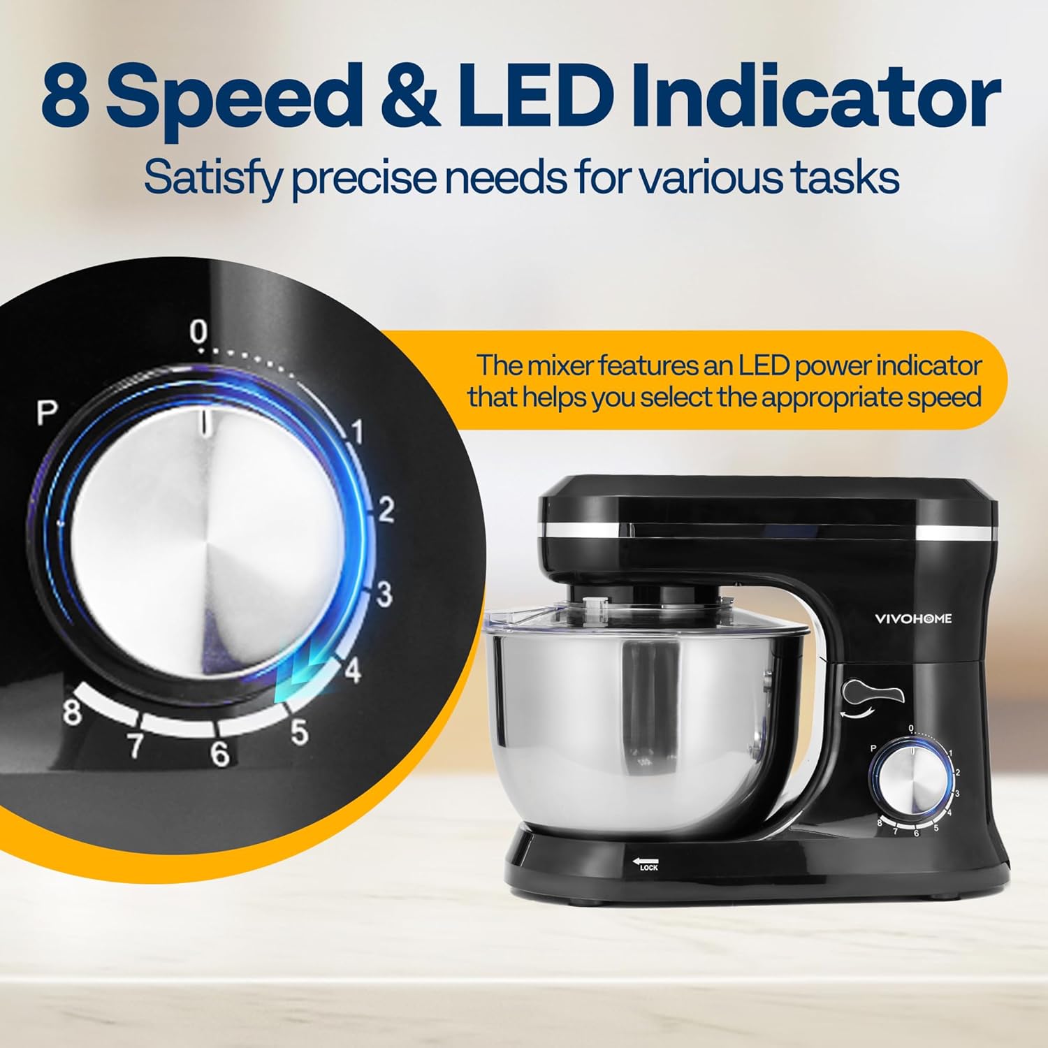 - 8 SPEED SETTINGS & LED INDICATOR: Handy 8-speed control meets the precise needs of various mixing tasks; Whether youāre mixing fine flour, thick dough, or eggs, youāll find the right speed; The pulse function delivers powerful bursts for better control, ideal for breaking down large chunks and preventing overmixing; The mixer includes an LED power indicator to help you select the correct speed; Suction cups on the base keep the kitchen mixer securely in place