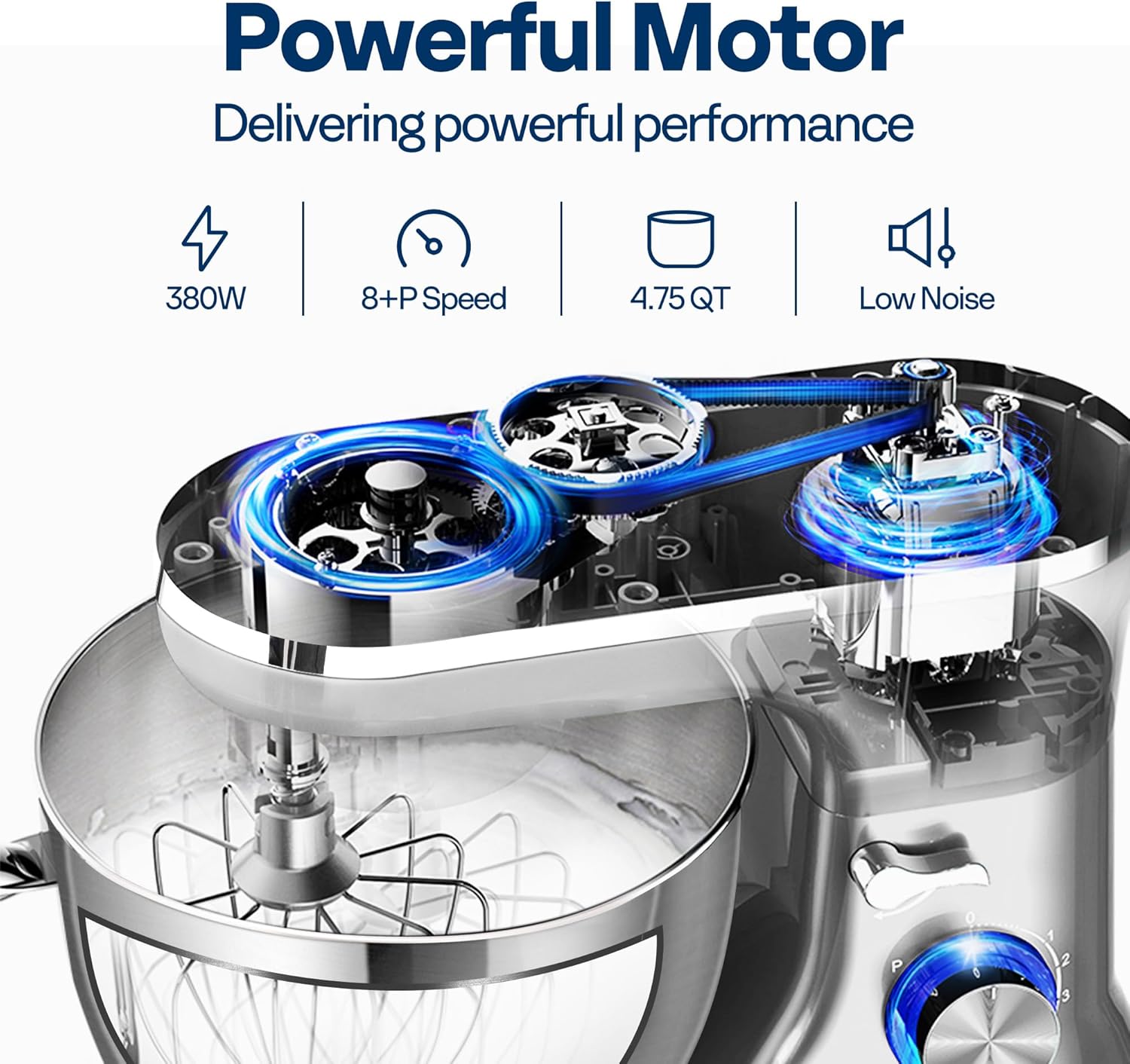 - POWERFUL MOTOR: Equipped with a high-performance 380-watt motor, this stand mixer ensures effortless and consistent whipping, beating, kneading, and thorough mixing; The all-metal gears provide stability and quiet operation (noise level ⤠76dB); The planetary mixing design moves the beaters around the bowl for even and thorough mixing
