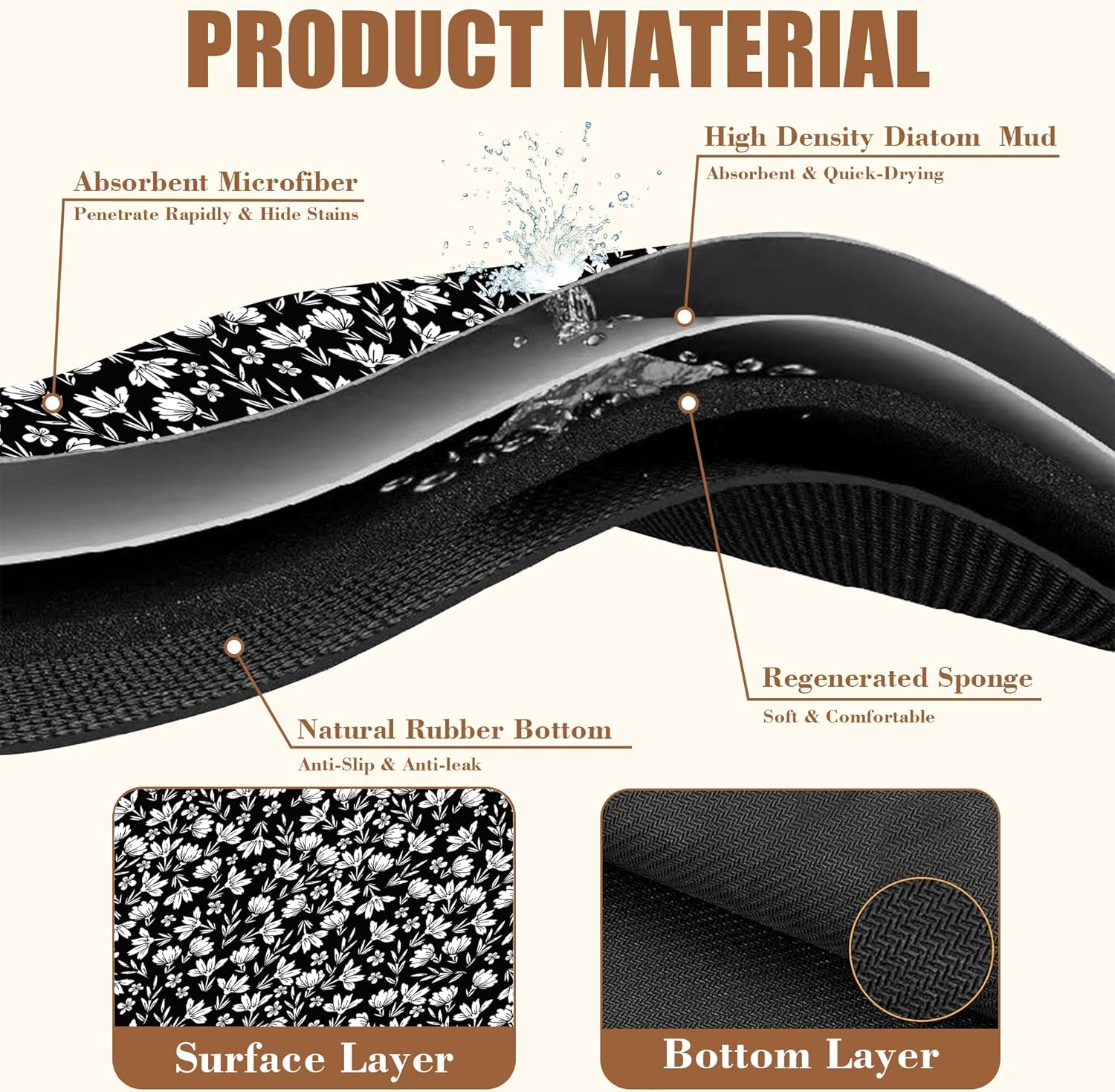 Black and White Flowers Dish Drying Mat for Kitchen Counter Coffee Bar Mat Hide Stain Absorbent Rubber Backed Drying Rack Pad Espresso Machine Coffee Table Accessories 15.7 x 23.6 Inch