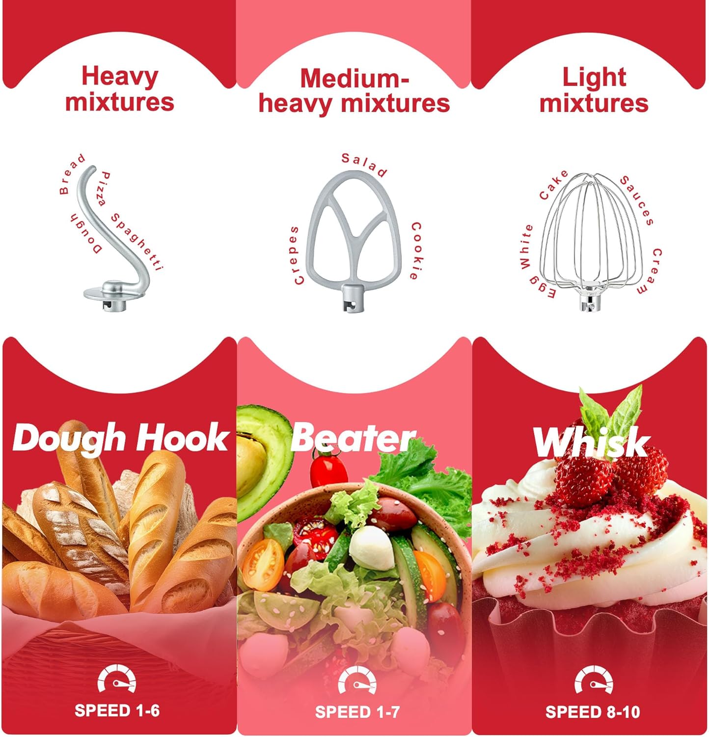 - Upgraded Accessories and Dishwasher Safe- Aluminium dough hook and flat beater with protection layer,stainless steel whisk are all easy to attach,more sturdy and durable. All of the attachments for the food mixer are dishwasher-safe for quick and easy cleaning.