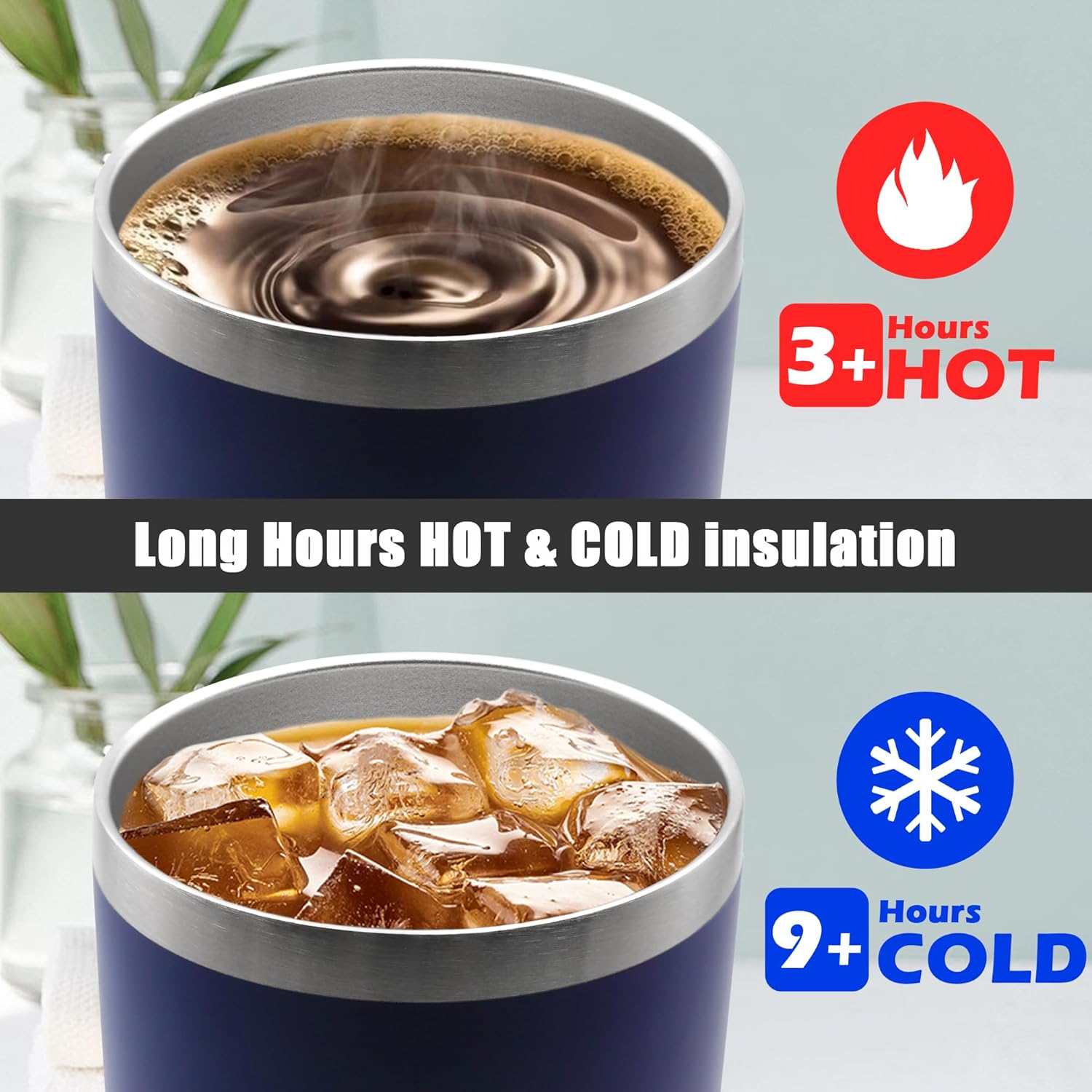 - DOUBLE WALL & VACUUM INSULATION - Thanks to the double wall vacuum insulated, the heat or cold transfer rate from your beverage to the outer wall of the tumbler is slowed down, which allows our tumblers to keep hot for over 3 hours and cool for over 9 hours